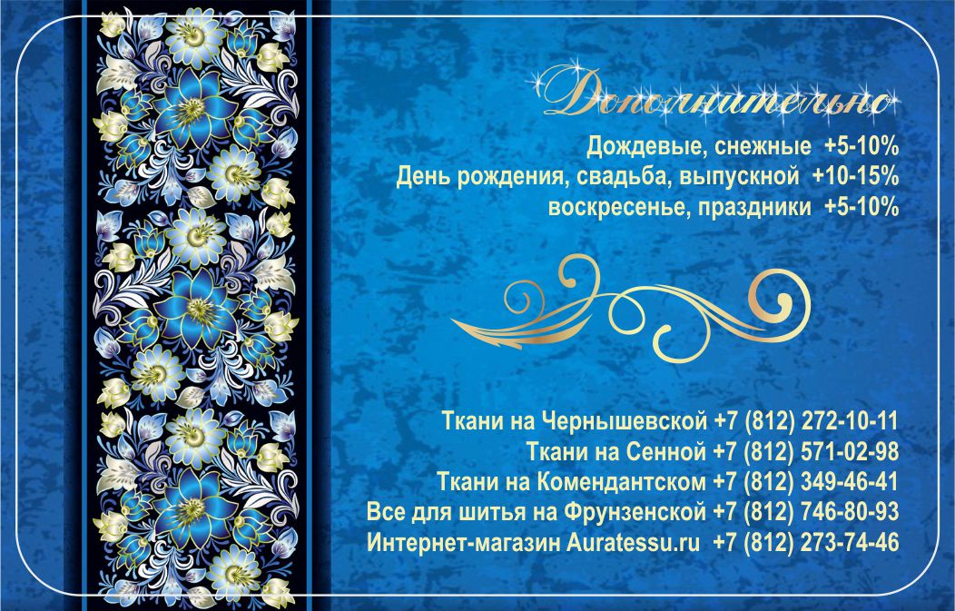 Только в этом магазине "Ткани на Чернышевской", Кирочная 30, в связи с ОТКРЫТИЕМ 2-й этажа каждому покупателю может быть выдана карта "Аватар" со скидкой до 35%: