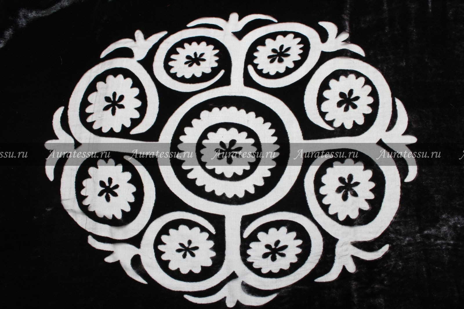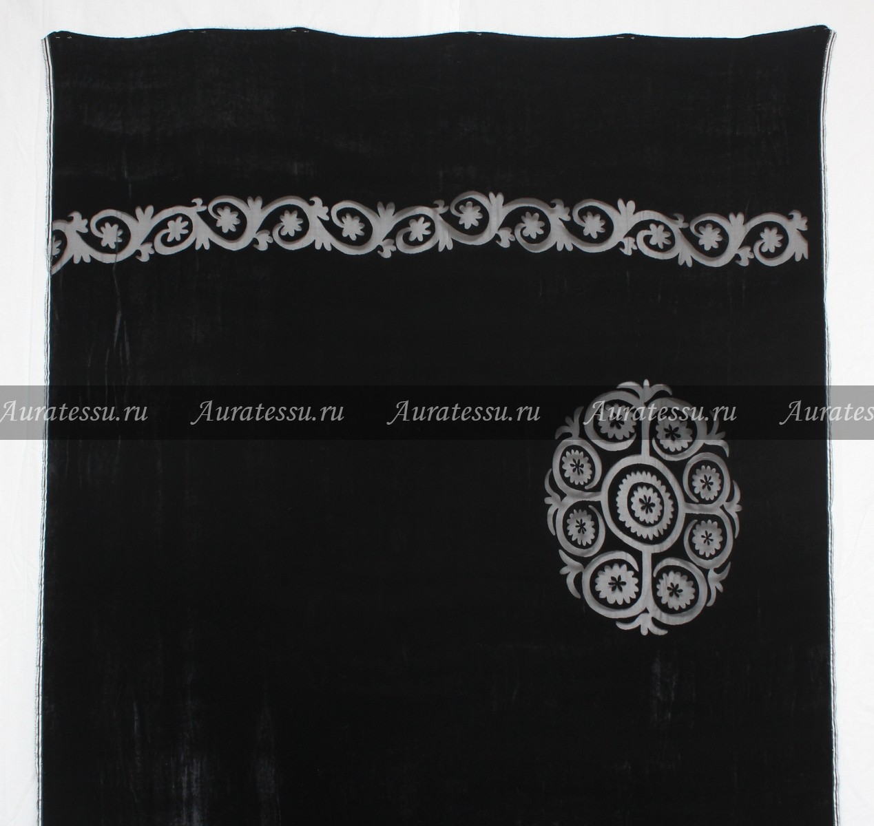 Дополнительная информация:Чёрный панбархат на тонком шёлковом полупрозрачном шифоне, с вензельным рисунком полосой и крупной розеткой. Ткань с лёгким черничным оттенком. Полоса деворе шириной 10 см расположена поперёк ткани. Цветочная розетка размером 35x40 см. находится на расстоянии 15 см от кромки и 20 см. от полосы-деворе. Полотно пластичное, ворс имеет разное направление и похож на плюш, слегка глянцевый. Но все детали кроя должны быть направленны в одну сторону во избежании разнотона. Подходит для пошива нарядной одежды свободных силуэтов. В наличии фабричные рулоны по 24-26 метров. Рекомендации по уходуБархат, велюр синтетический: Синтетический бархат, велюр в том числе и на трикотажной основе стирать просто и можно не гладить, если достаточно места, чтобы высушить его в расправленном виде. Можно стирать в машинке вывернув наизнанку с обычным стиральным порошком для цветного белья при 30-40°С без отжима или с легким отжимом. Если потребуется погладить, то лучше на весу утюгом с вертикальным отпаривателем или гладить на махровом полотенце, сложенном в 2-3 раза.