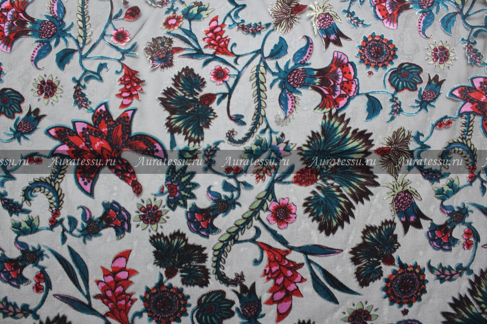 Дополнительная информация:Панбархат деворе с цветочным узором на чёрном шифоне. Ткань тонкая и полупрозрачная. Бархатный узор деворе в виде растительно-цветочного орнамента. Цветовая гамма рисунка в розово- красных, коричнево-лиловых, зеленовато-мятных тонах с акцентом на цвет тёмной морской волны. Ворс имеет чёткое направление и это необходимо учитывать при раскрое изделия. Так же от направления ворса меняется интенсивность цвета. Сшитое против ворса изделие будет смотреться более выигрышно. Полотно нежное, пластичное, требует бережного ухода. Подходит для пошива нарядной одежды не узких силуэтов. Рекомендации по уходуБархат, велюр синтетический: Синтетический бархат, велюр в том числе и на трикотажной основе стирать просто и можно не гладить, если достаточно места, чтобы высушить его в расправленном виде. Можно стирать в машинке вывернув наизнанку с обычным стиральным порошком для цветного белья при 30-40°С без отжима или с легким отжимом. Если потребуется погладить, то лучше на весу утюгом с вертикальным отпаривателем или гладить на махровом полотенце, сложенном в 2-3 раза.