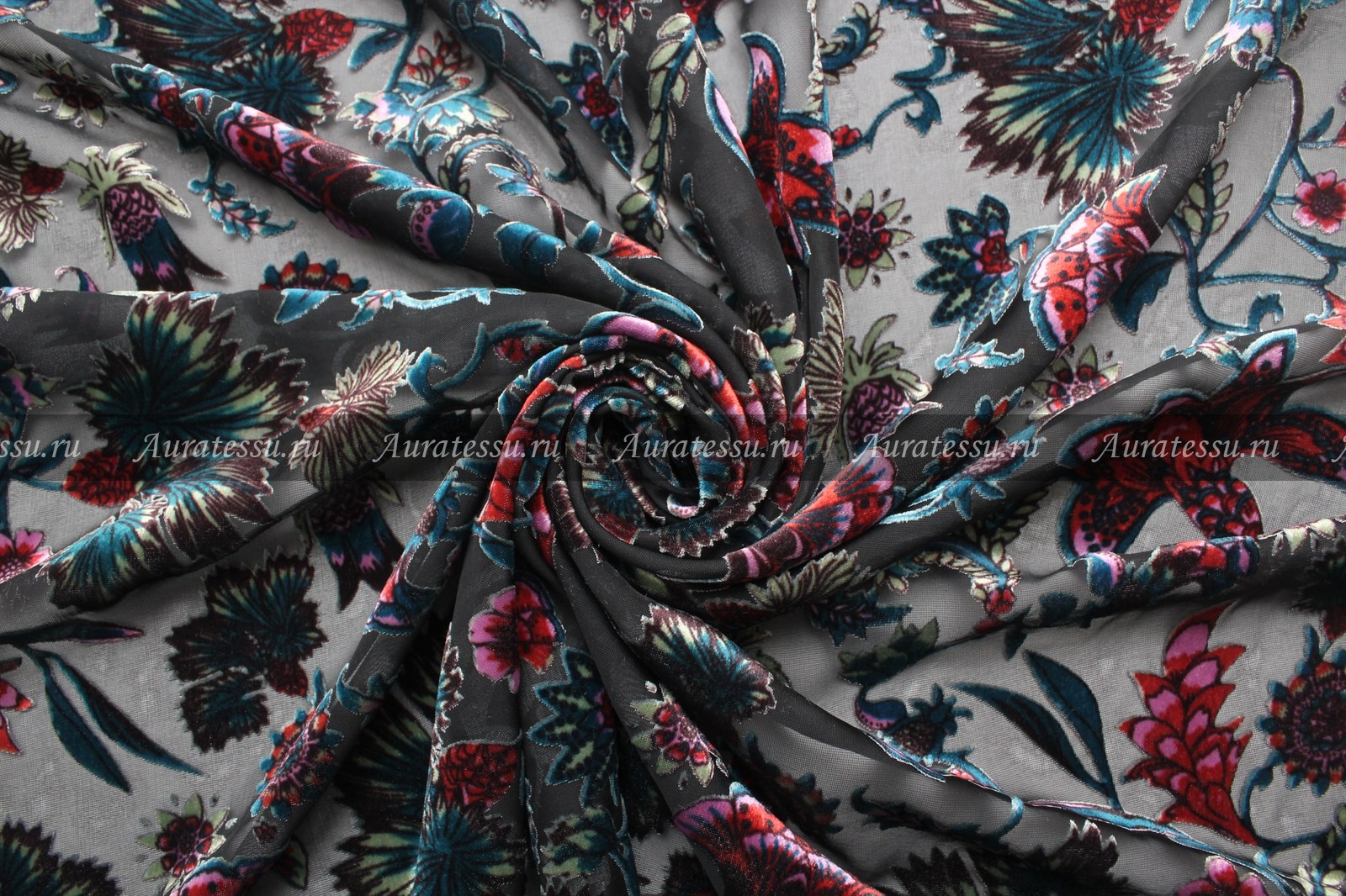 - Панбархат деворе цветочный орнамент на чёрном шифоне