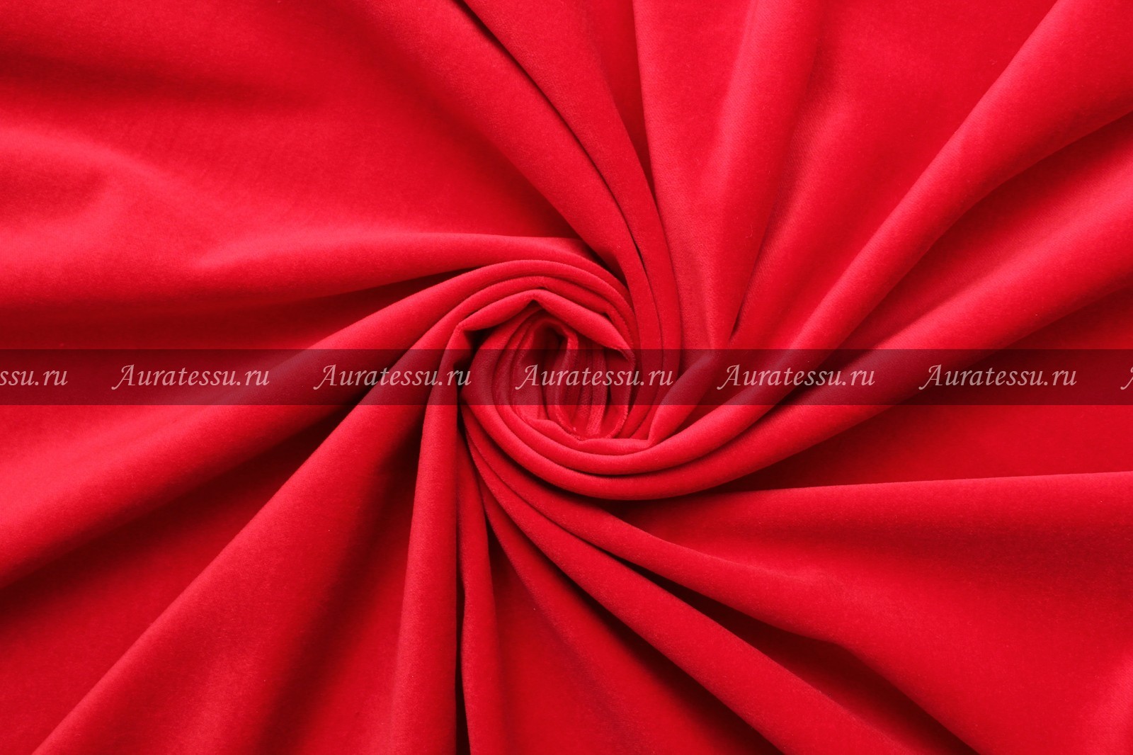 Средней плотности бархатное полотно яркого красного цвета. Ворс коротенький, приглаженный, имеет чёткое направление. Поверхность бархата мягкая, приятная на ощупь и имеет легкий блеск. В зависимости от угла зрения, относительно направления ворса бархат переливается от ярко-красного до сочного, густого красного оттенка. Направление ворса следует учесть при расчете требующегося метража бархата на изделие. Ткань подходит для шитья жакетов, юбок, жилетов, платьев.