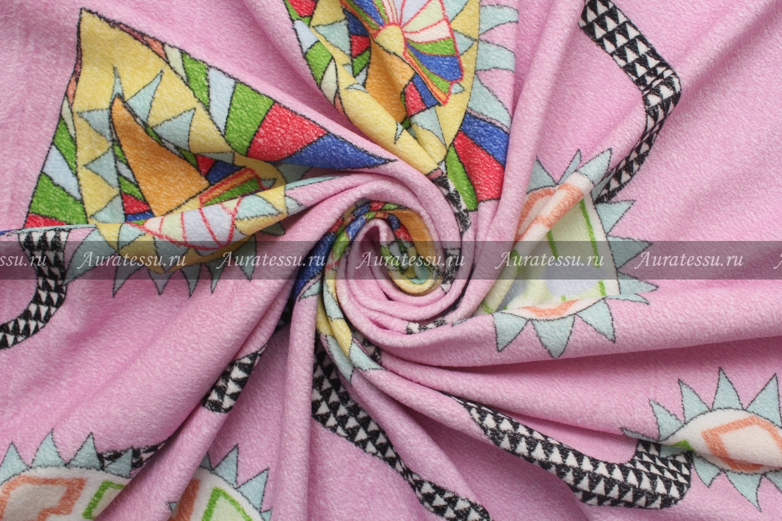 Дополнительная информация:Средней плотности эластичный велюр сиреневато-розового окраса по белой основе. На ткани крупный узор напоминающий «воздушных змеев». Геометрические фигуры в мятных, жёлтых, красных, синих, зелёных, чёрных тонах. Ворс короткий, приглаженный, имеет направление. Полотно уютное, пластичное. Подходит для пошива трикотажной одежды разнообразных силуэтов. Рекомендации по уходуБархат, велюр синтетический: Синтетический бархат, велюр в том числе и на трикотажной основе стирать просто и можно не гладить, если достаточно места, чтобы высушить его в расправленном виде. Можно стирать в машинке вывернув наизнанку с обычным стиральным порошком для цветного белья при 30-40°С без отжима или с легким отжимом. Если потребуется погладить, то лучше на весу утюгом с вертикальным отпаривателем или гладить на махровом полотенце, сложенном в 2-3 раза.