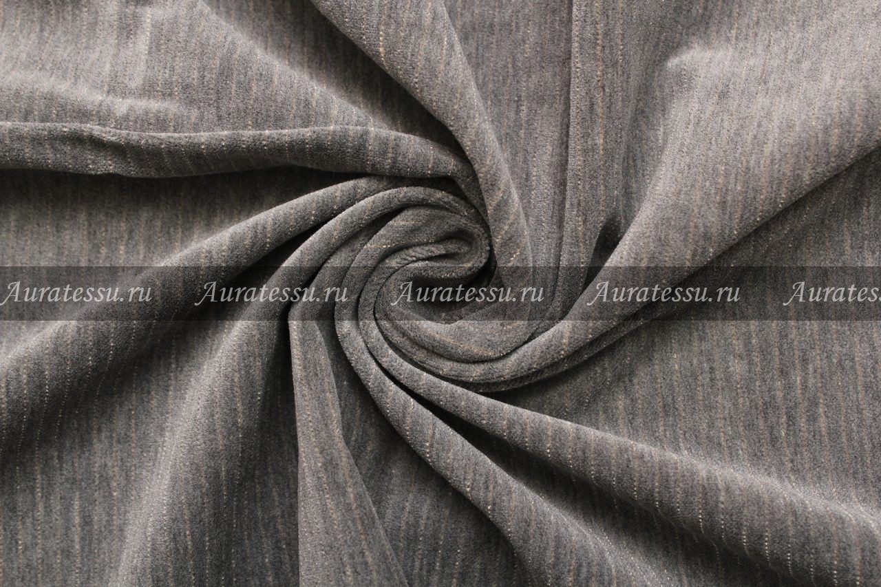Мягкий пластичный бархат серого цвета с густым невысоким ворсом. На ткани тонкая бежевая продольная полоска. Поверхность бархата мягкая, приятная на ощупь. Цвет ворса меняет глубину и интенсивность оттенка в зависимости от угла зрения относительно направления ворса и освещенности. Ворс имеет направление, что следует учесть при расчете расхода ткани на изделие. Подходит для шитья жакетов, юбок, жилетов, платьев.