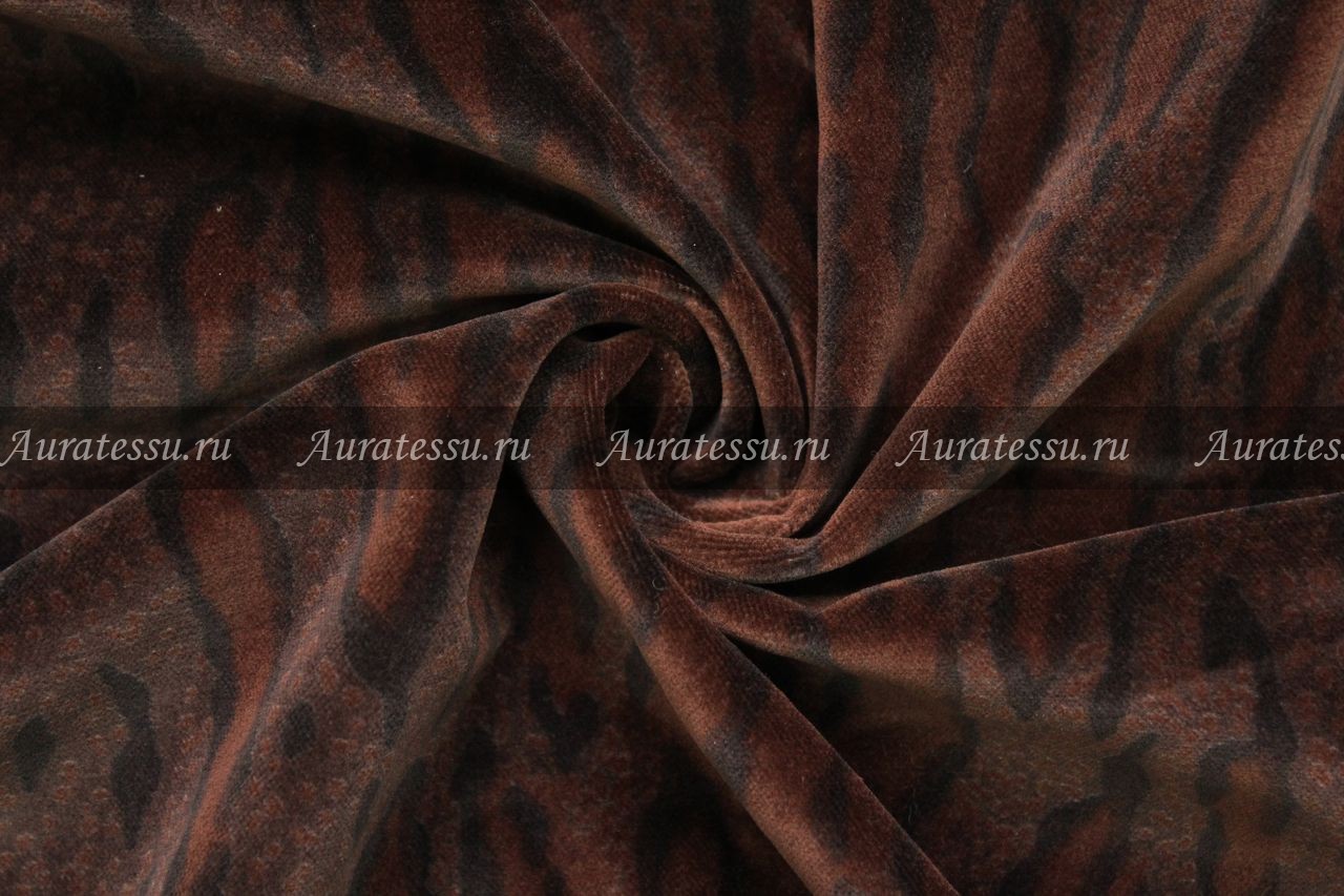 Дополнительная информация:Бархат-стрейч темного-шоколадного цвета с тирговым принтом, который включает разные оттенки коричневого (черно-коричневый, шоколадный, коричневый). Ворс бархата изготовленный из хлопка, плотно прилегает к основе ткани. Ткань мягкая и пластичная, очень приятная на ощупь. Рекомендации по уходуБархат, велюр синтетический: Синтетический бархат, велюр в том числе и на трикотажной основе стирать просто и можно не гладить, если достаточно места, чтобы высушить его в расправленном виде. Можно стирать в машинке вывернув наизнанку с обычным стиральным порошком для цветного белья при 30-40°С без отжима или с легким отжимом. Если потребуется погладить, то лучше на весу утюгом с вертикальным отпаривателем или гладить на махровом полотенце, сложенном в 2-3 раза.