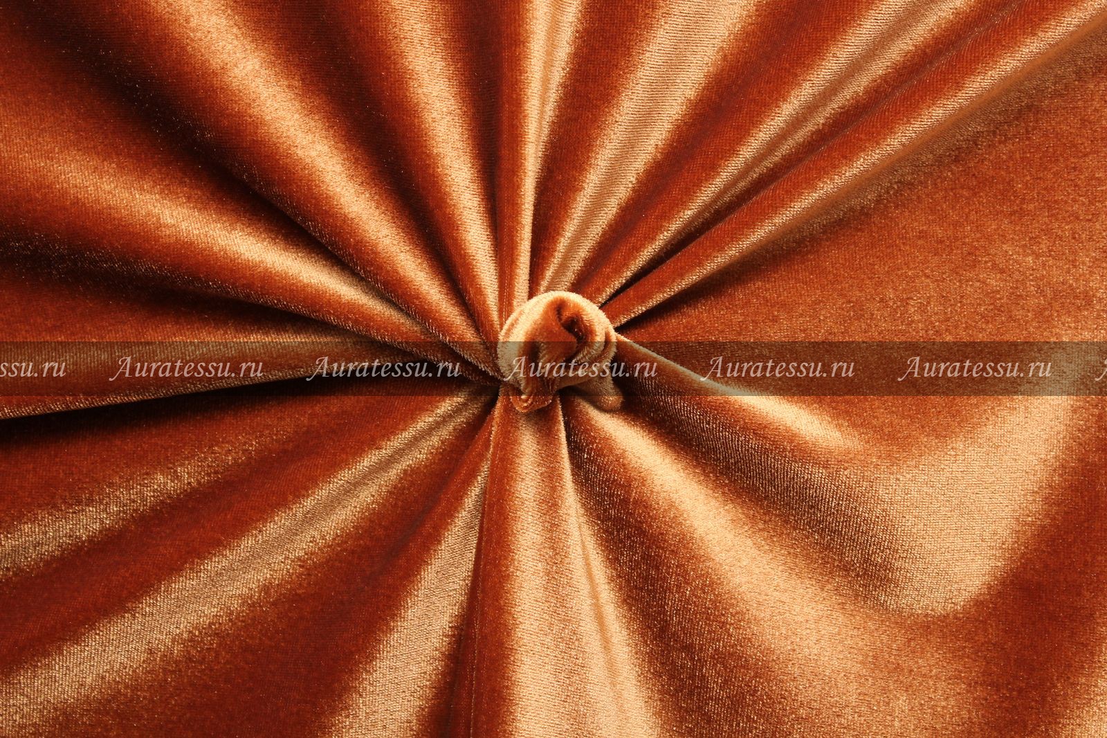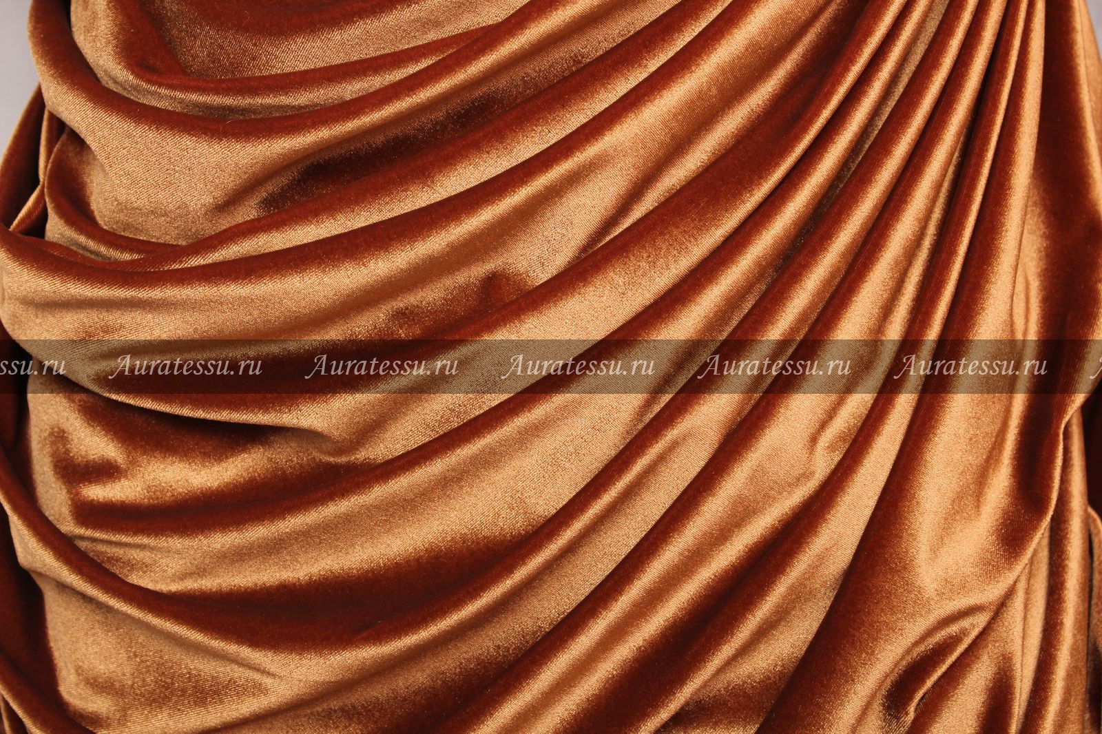 Бархат-стрейч сочного карамельно-песочного цвета на трикотажной основе, с коротким упругим ворсом, имеющим чёткую направленность. Насыщенность оттенка бархата очень зависит от направления ворса: если раскрой произведен против ворса, то изделие имеет более яркий, густой насыщенный цвет. Ткань очень пластична, хорошо драпируется, совсем не мнётся, и прекрасно тянется не теряя форму. В поперечном направлении ткань больше растяжима, чем в долевом.