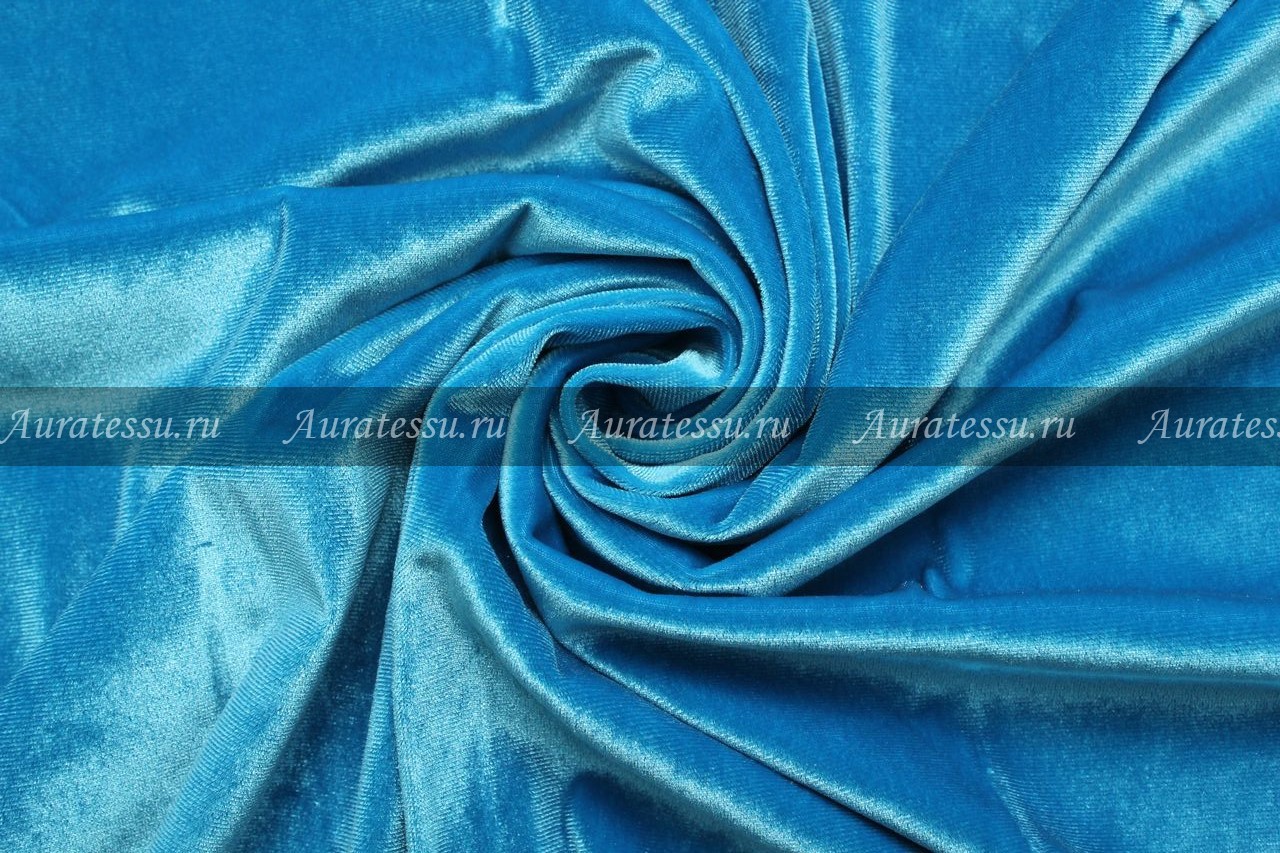 Дополнительная информация:Бархат-стрейч средней плотности приятного ярко-голубого цвета на трикотажной основе, с коротким упругим ворсом, имеющим чёткую направленность. Насыщенность оттенка бархата очень зависит от направления ворса: если раскрой произведен против ворса (желательно), то изделие имеет более яркий, густой насыщенный цвет. Ткань очень пластична, хорошо драпируется, совсем не мнётся, и прекрасно растягивается, не теряя форму. Подходит для пошива нарядной одежды как узких, так и объёмных, расклешенных силуэтов. Рекомендации по уходуБархат, велюр синтетический: Синтетический бархат, велюр в том числе и на трикотажной основе стирать просто и можно не гладить, если достаточно места, чтобы высушить его в расправленном виде. Можно стирать в машинке вывернув наизнанку с обычным стиральным порошком для цветного белья при 30-40°С без отжима или с легким отжимом. Если потребуется погладить, то лучше на весу утюгом с вертикальным отпаривателем или гладить на махровом полотенце, сложенном в 2-3 раза.