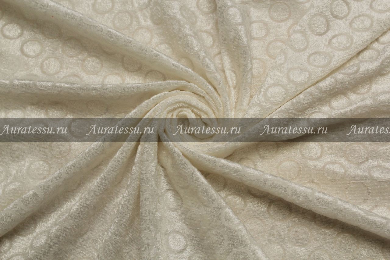 Дополнительная информация:Молочно-белый велюр с жаккардовым узором в овальное колечко диаметром примерно 17 мм. Ворс на полотне коротенький, глянцевый, чётко направленный, слегка серебристый. Велюр средней плотности, ближе к тонкому, на трикотажной основе, мягкий и пластичный, отлично драпируется. Подходит для пошива трикотажной одежды разнообразных силуэтов. Рекомендации по уходуБархат, велюр синтетический: Синтетический бархат, велюр в том числе и на трикотажной основе стирать просто и можно не гладить, если достаточно места, чтобы высушить его в расправленном виде. Можно стирать в машинке вывернув наизнанку с обычным стиральным порошком для цветного белья при 30-40°С без отжима или с легким отжимом. Если потребуется погладить, то лучше на весу утюгом с вертикальным отпаривателем или гладить на махровом полотенце, сложенном в 2-3 раза.
