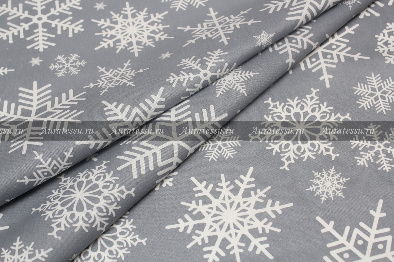 24-01802 Цена 390 руб/метр - Хлопок бязь Снежинка 100%хлоп ш146 190г/мп на сером фоне