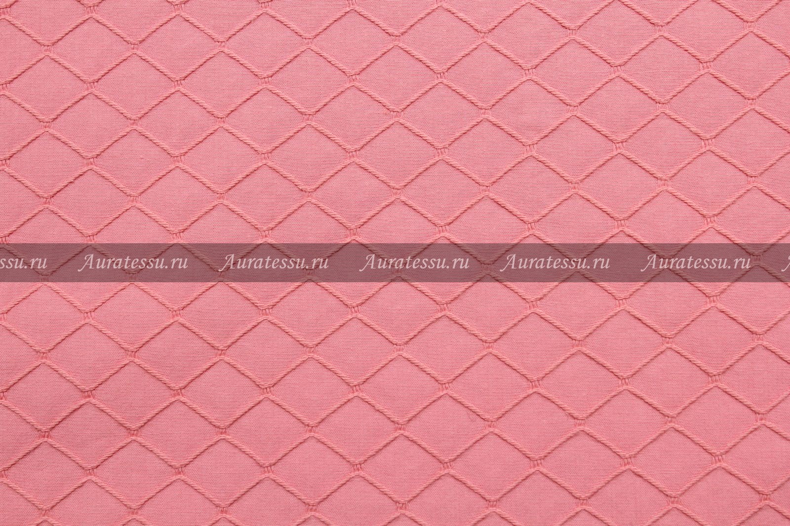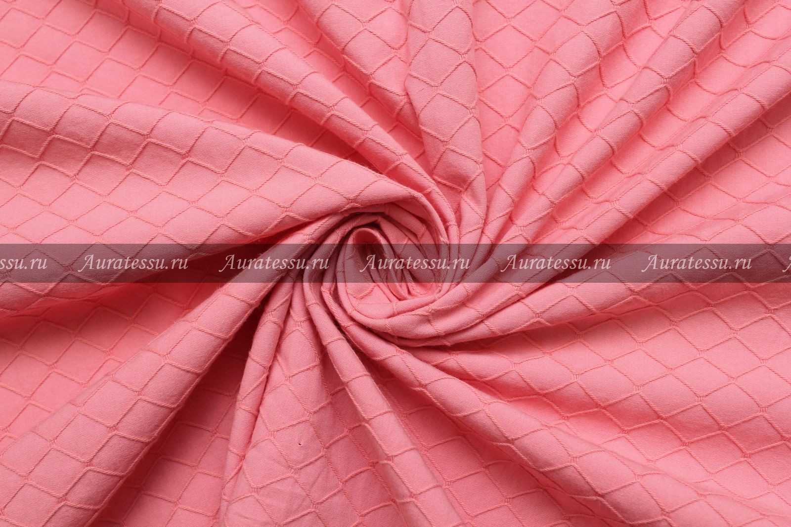 Средней плотности 300 г/м жаккардовый хлопок розового цвета. По лицевой стороне выпуклый рисунок в не крупный ромбик, напоминает узор выложенный шнуром. Ткань упругая, плотно соткана, отлично держит форму. Подходит для пошива летней костюмной и плательной одежды прямых, классических силуэтов.