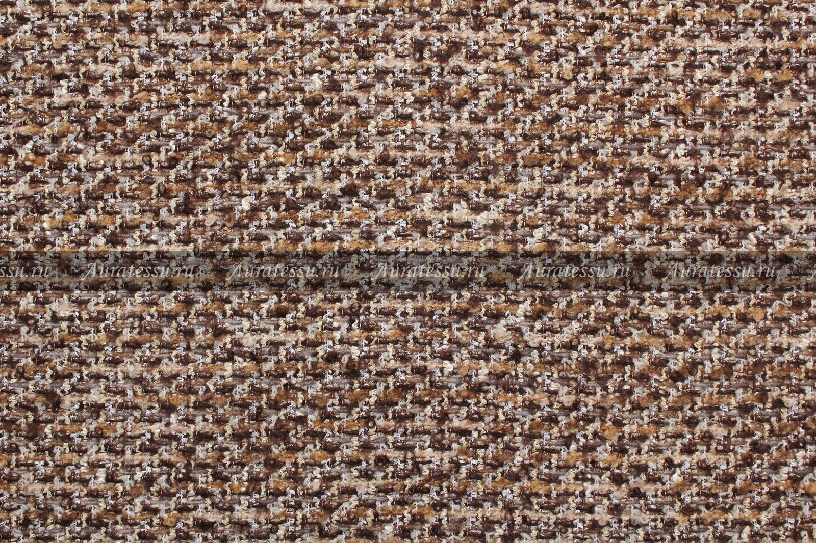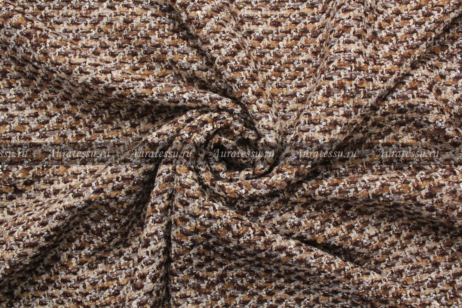 Средней плотности, рыхлое жаккардовое полотно в стиле Chanel. Ткань мягкая, пластичная, выполнена в коричневых тонах из фактурных нитей букле. Рисунок напоминает мелкую шахматку-ромбик. Нити коричневого, серого, кремового, ванильного бежевого цветов. Полотно требует укрепления срезов деталей клеевыми материалами. Подходит для пошива плательной и костюмной одежды классических силуэтов.