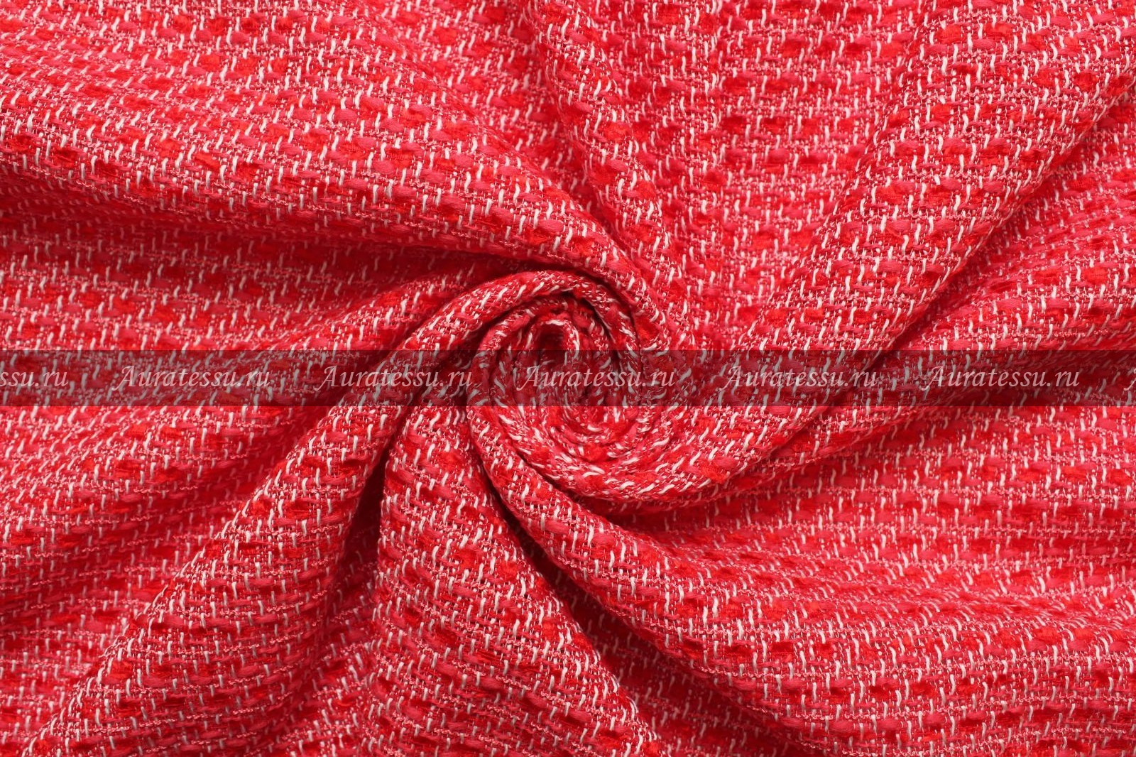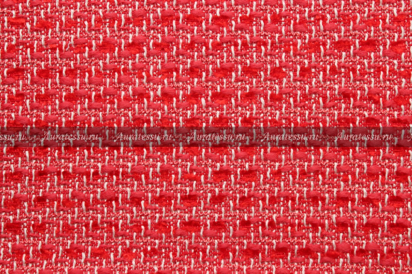 Средней плотности костюмная ткань в стиле Chanel с фактурным мелко жаккардовым переплетением на рыхлой основе. Цветовая гамма в белом, красном, розовато-коралловом цвете. Разряженная основа ткани придаёт полотну пластичность и в то же время кручёные нити делают ткань упругой. Подходит для пошива костюмной одежды в стиле Chanel. Желательно детали кроя укреплять дублирующими материалами.