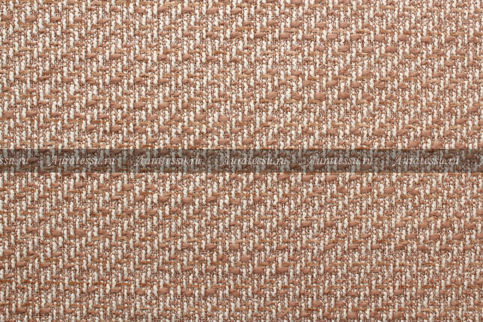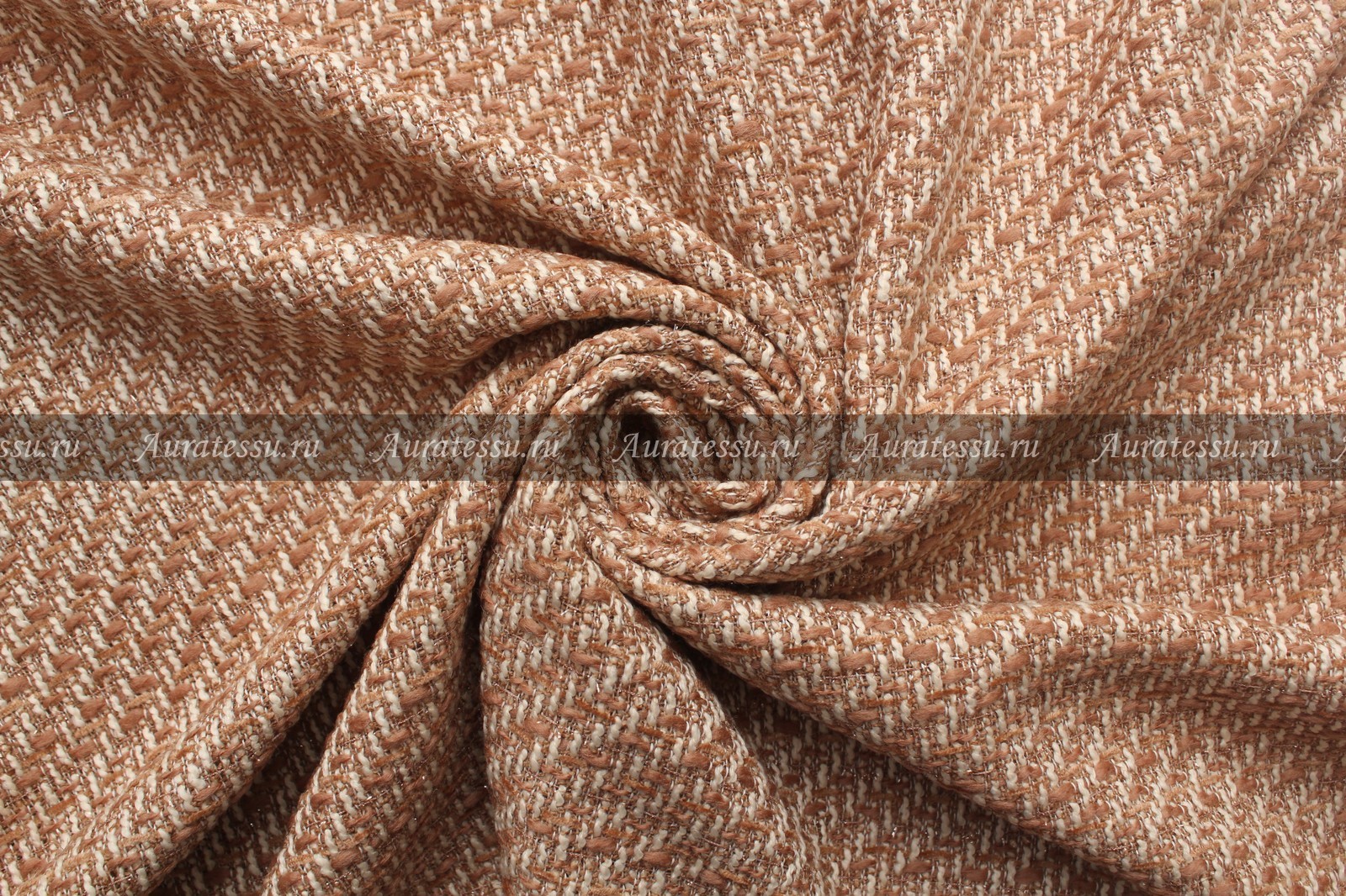 Средней плотности, жаккардовое полотно в стиле Chanel в розовато-бежевом и молочно белом цветах. В узор полотна воткана тонкая блестящая поперечная ниточка с интервалом около 2 см. Бежевые нити фактурные, объёмной толстой крутки, белые кручёные, буклированные. Полотно пластичное с немного рыхлой основой. Подходит для пошива костюмной одежды классических силуэтов.