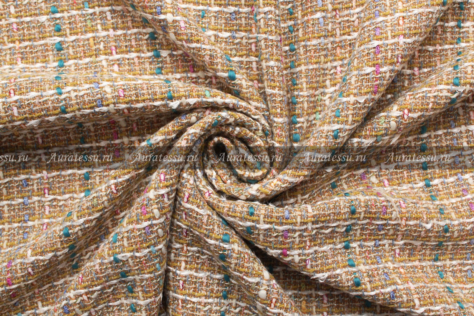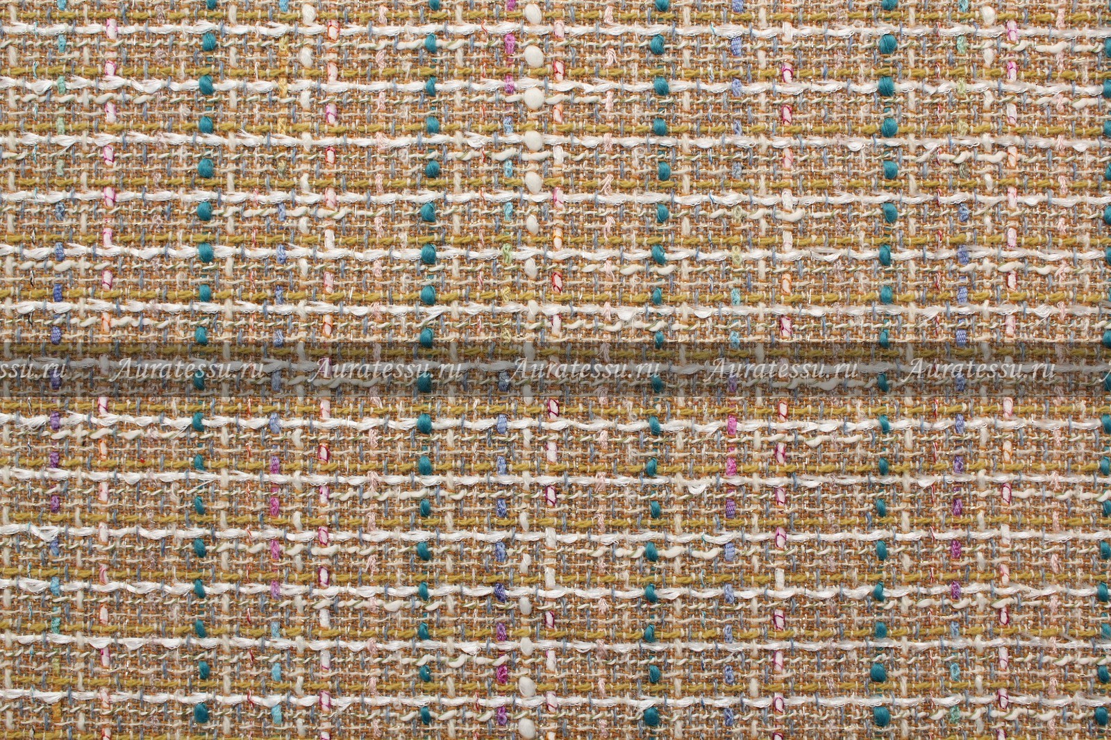 Средней плотности классическое жаккардовое полотно в стиле Chanel в желтовато-песочных тонах. По лицевой стороне рисунок фактурными нитями тёмно-бирюзового цвета в продольную полосу с интервалом 7 см. и поперечную белую полоску через каждые 16 мм. Белая полоска слегка блестящая, ворсистая. По фону ткани в переплетении учувствуют буклированные фасонные нити сиреневого, фиалкового, розового цветов. Ткань нарядная, пластичная. Подходит для пошива плательной и костюмной одежды классических силуэтов.