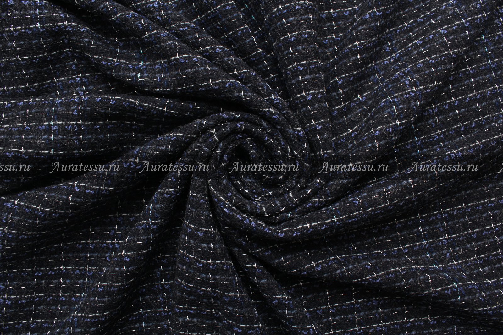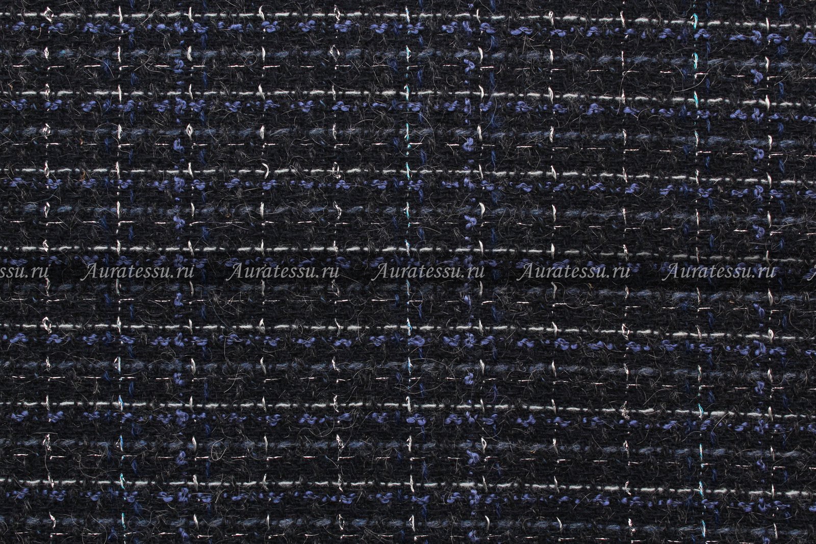 Ткань костюмно-пальтовая Chanel букле тёмно-синяя с сиреневой, белой, серой, серебристой клеткой