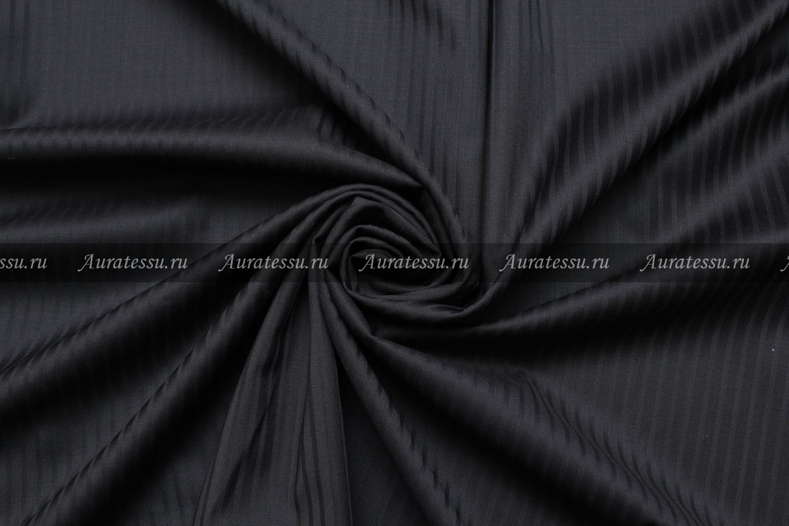 Средней плотности 330 г/м эластичная костюмная ткань чёрно-синего цвета в продольную жаккардовую полоску с элементами узора ёлочка. Полоски двух размеров ширины 2,5 4,5 мм. соответственно, с поочерёдным узором ёлочка. Полоса не явная, лицевая сторона ткани шлифованная, ткань держит форму и отлично подходит для пошива классической офисной мужской костюмной одежды.