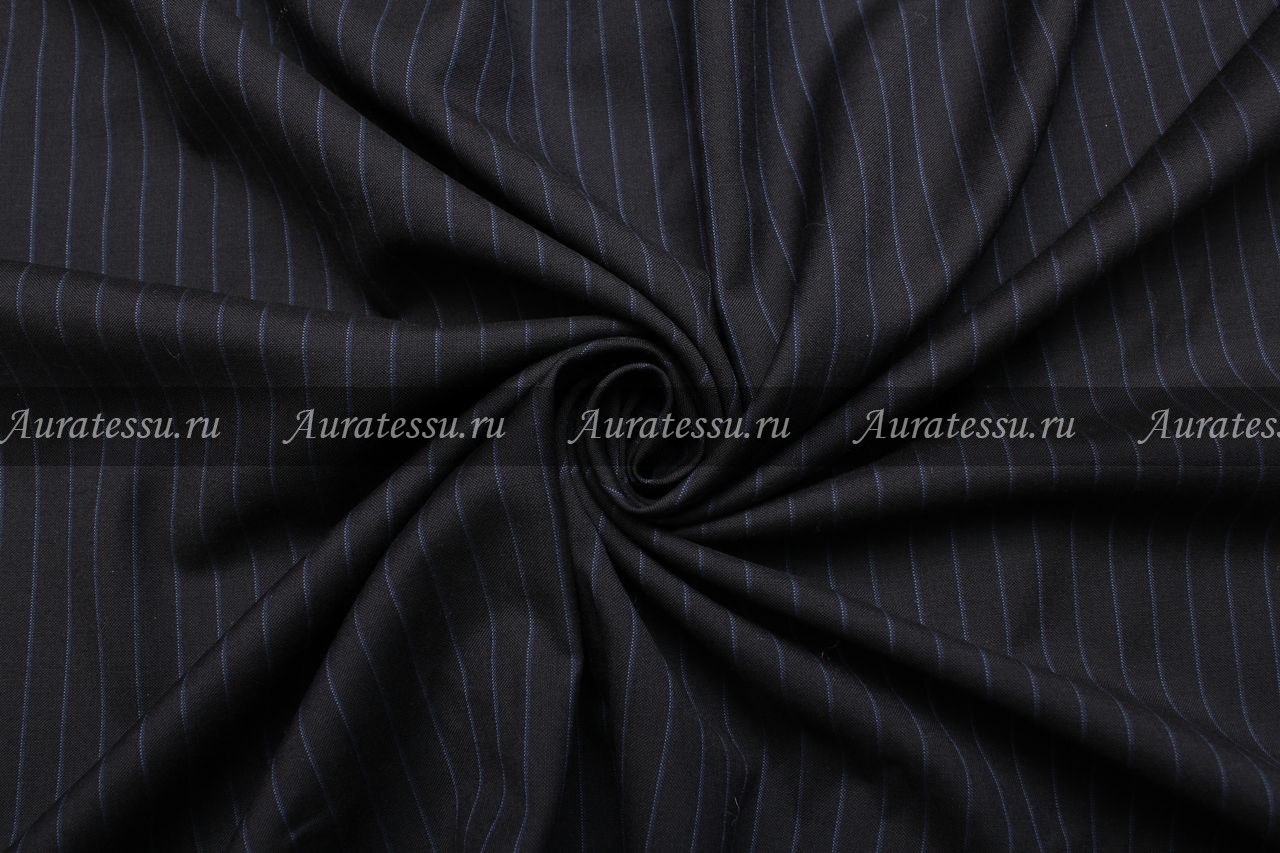 Средней плотности (ближе к тонкой, офисной) костюмная шерсть чёрного цвета с синим оттенком. На ткани рисунок продольной полоски ярко-синего (с оттенками) цвета, толщиной в 3 нити. Расстояние между полосками 12 мм. Полотно держит форму, подходит для пошива костюмной одежды для офиса и на не холодное время года.