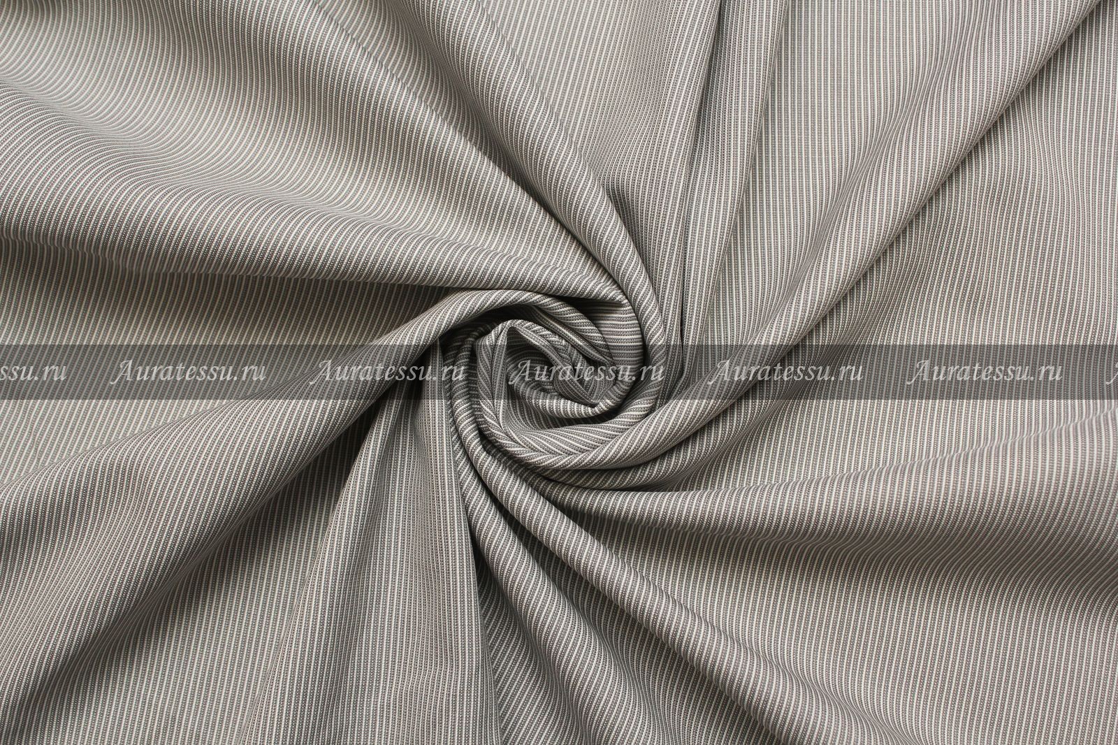 Упругая костюмная ткань с фактурным переплетением в продольную полоску. Полоски очень тонкие, толщиной в 1-2 нити, но контрастные. Попеременное сочетание светло-серого, молочного цветов, лёгкий оливковый оттенок. Ткань плотно соткана, шлифованная с лицевой поверхности, отлично держит форму, прекрасно утюжиться. Подходит для пошива костюмной мужской и женской одежды прямых, классических силуэтов.