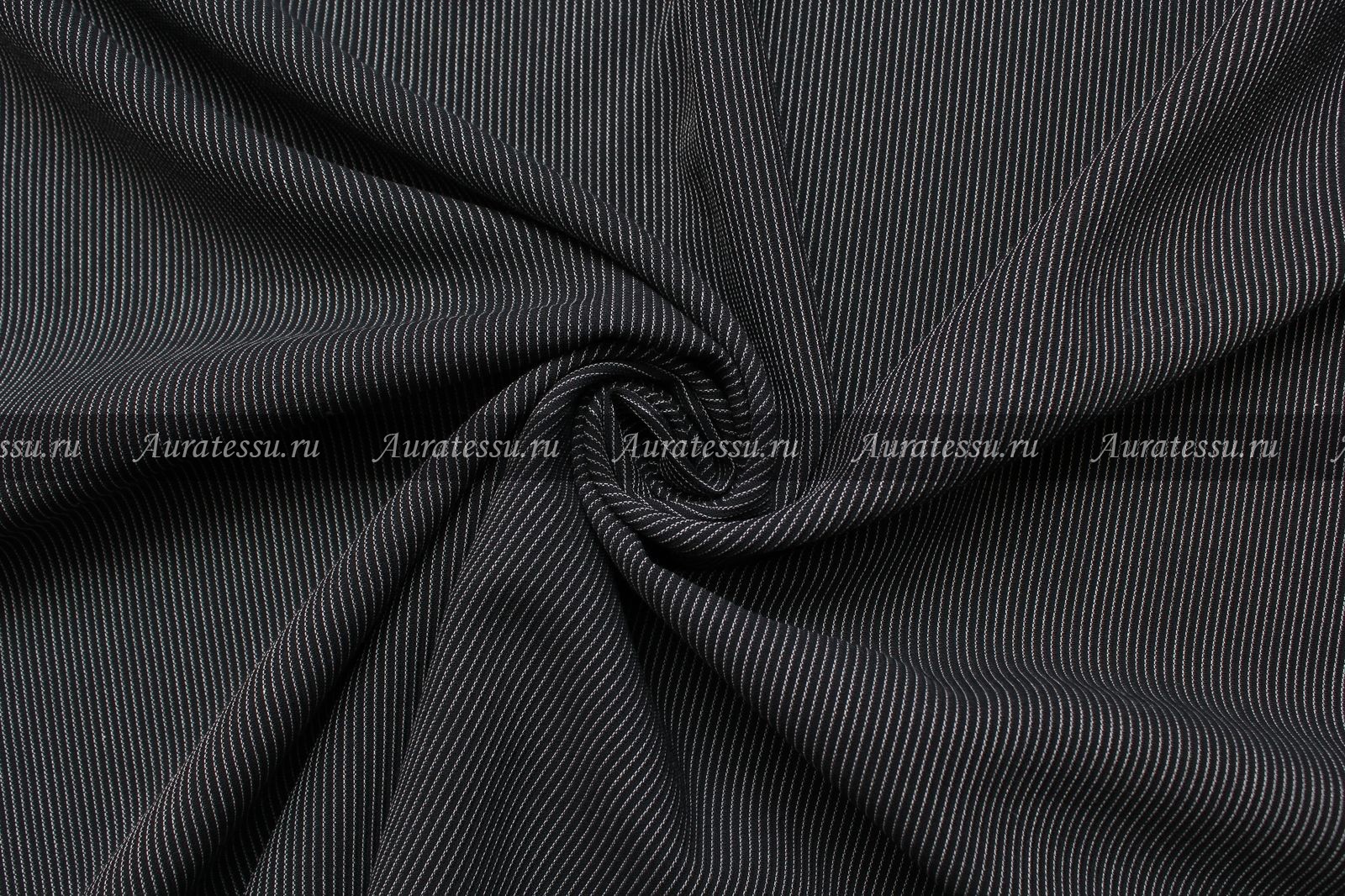 Эластичная костюмная ткань плотностью 350 г/м тёмно-синего цвета в тонкую продольную полоску белого цвета. Полоски толщиной в две нити частотой через 2,5 мм. Полотно упругое и пластичное, при растяжении не деформируется. Подходит для пошива деловой костюмной одежды прямых, зауженных, классических силуэтов.