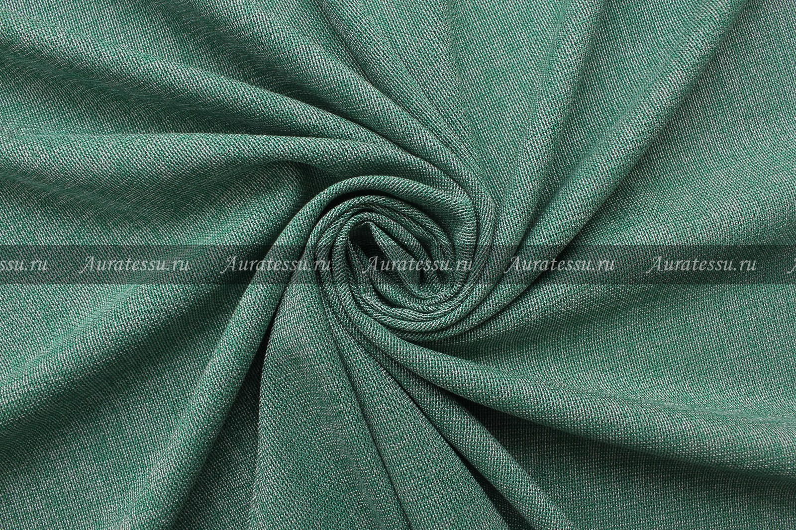 Средней плотности, упругий и эластичный костюмный креп с пёстрым переплетением нитей зелёного и белого цветов. Синие нити имеют два оттенка: тёмно-синий и яркий синий цвет. Полотно матовое, зернистое на ощупь. Подходит для пошива плательной и костюмной одежды разнообразных силуэтов.