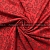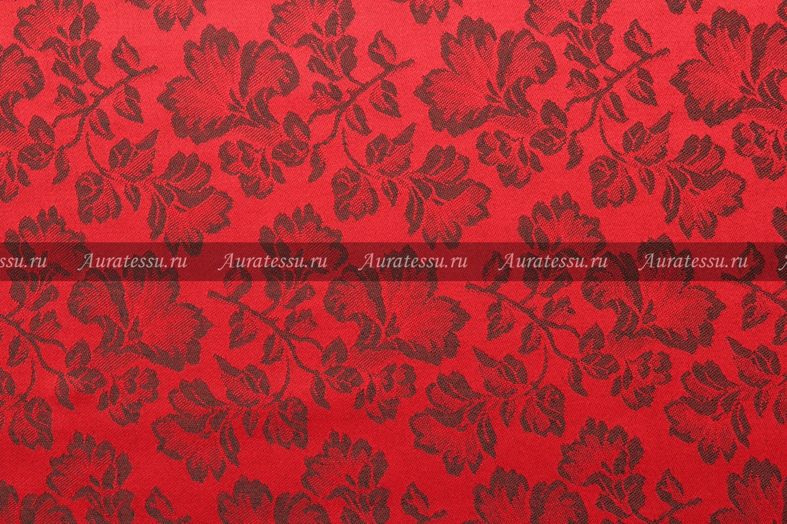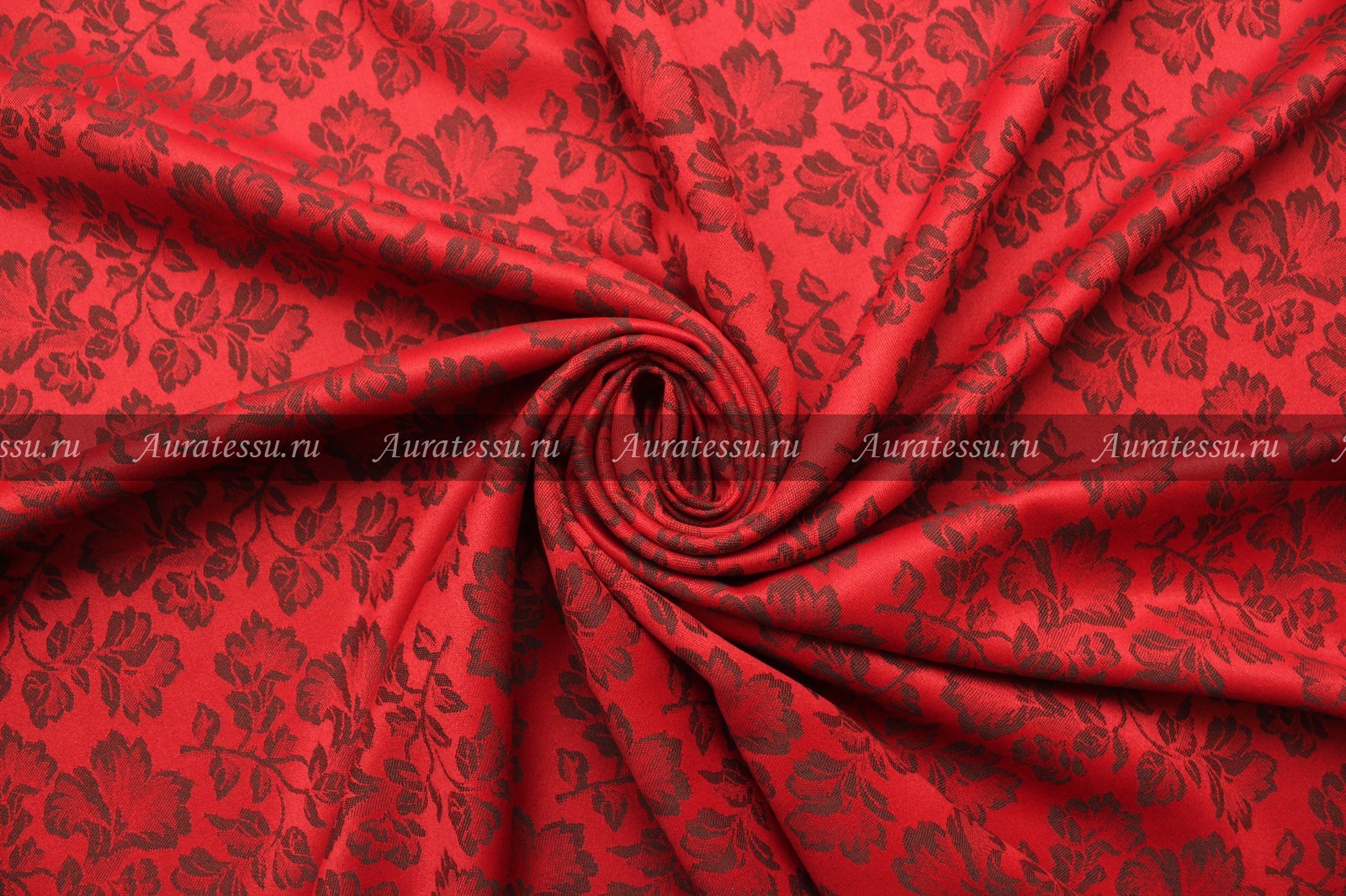 Средней плотности шерстяной жаккард с не крупным цветочным (бутоньерки) узором на красном фоне. Рисунок в серовато-зеленоватом цвете. Полотно гладкое, без блеска, пластичное и мало сминаемое.  Подходит для пошива плательной, костюмной одежды классических, романтических силуэтов.