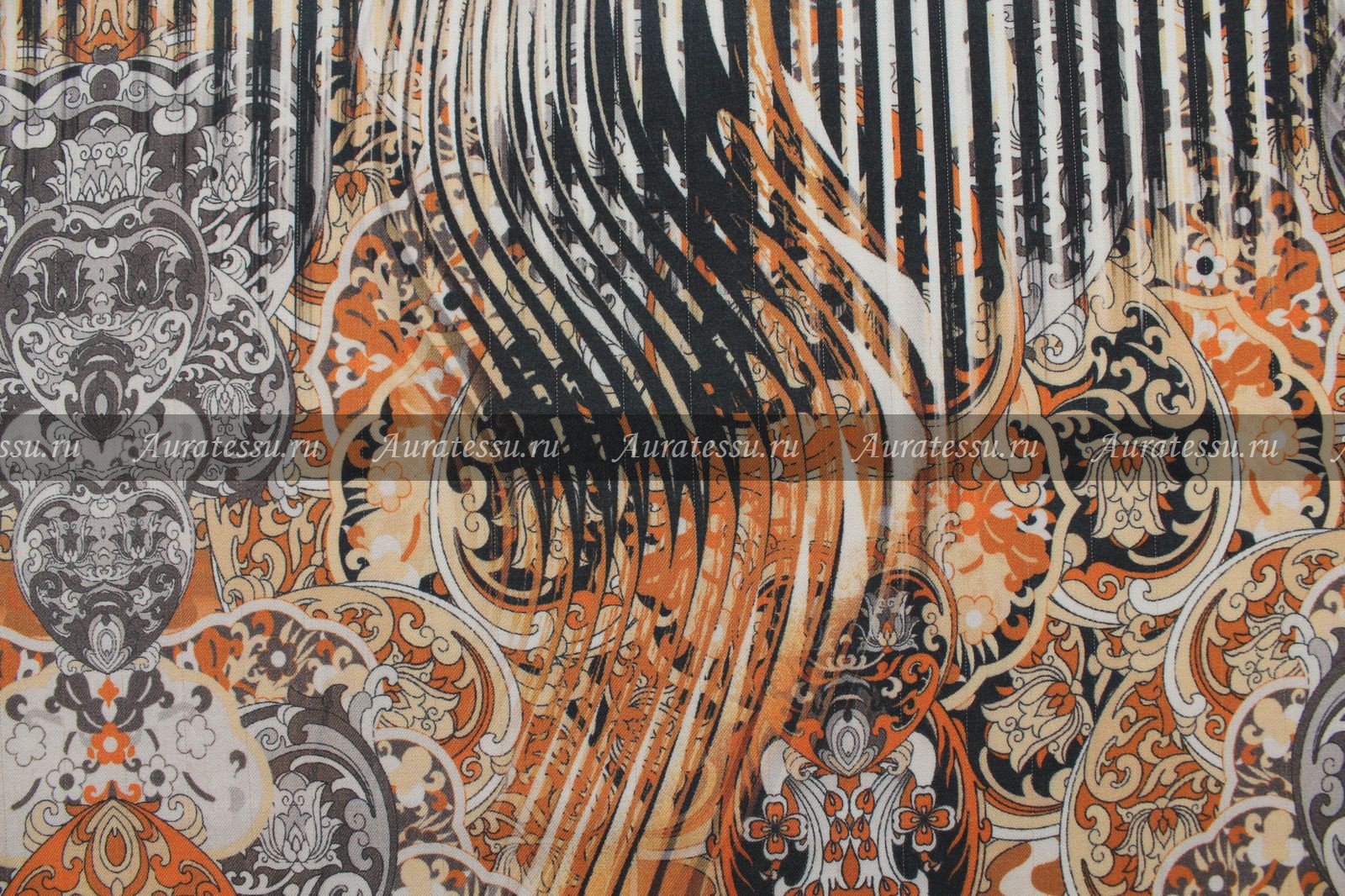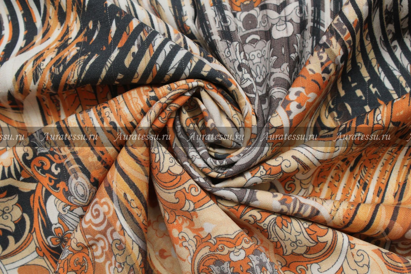 Шерстяная эластичная ткань в еле заметную продольную, тонкую полоску. Полотно средней плотности, упругое, хорошо держит форму. У купона продольный рисунок: с одной стороны тёмно-серого цвета постепенно переходящий в орнамент на противоположной стороне купона. Изменение цвета происходит с появления светло-серых лучей-полос накладывающихся на восточный серо-рыжий орнамент со сложным, прихотливым узором, полосы переходят в волны. Узор чётко вырисован, строгий и лаконичный. Одного купона достаточно для пошива платья, юбка, жакета, длина купона 141 см. Подходит для строгих и объёмных силуэтов.