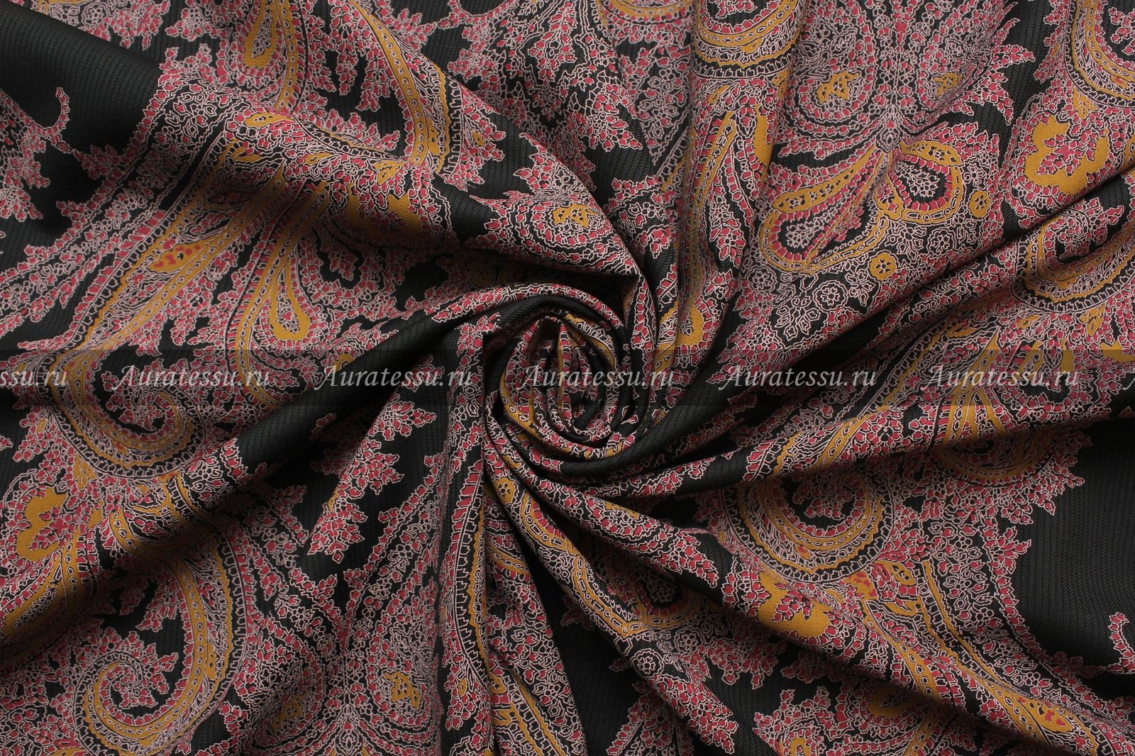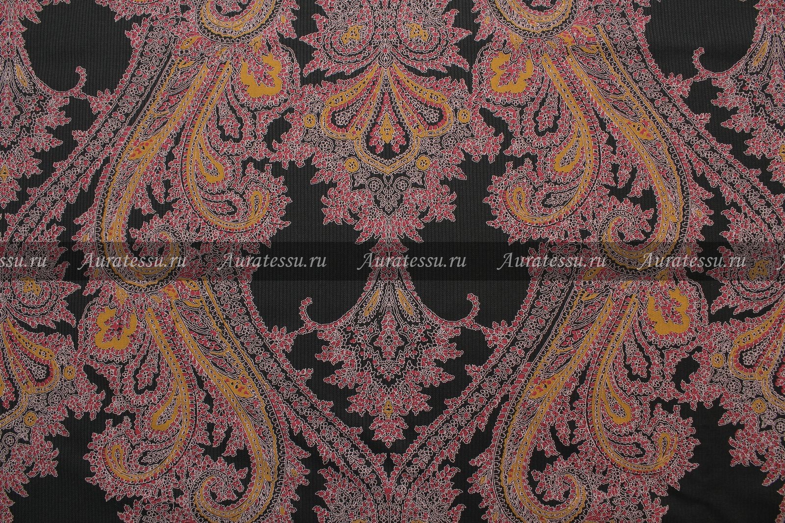 Шерсть Etro чёрная в полоску с печатным вензельным узором в розовых и охристых тонах