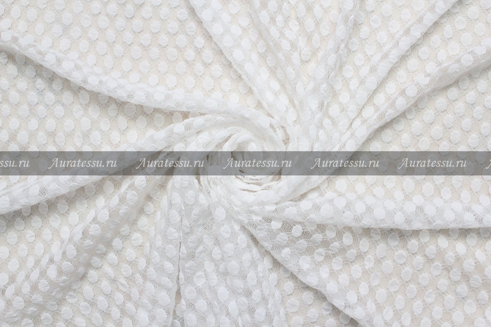 Дополнительная информация:Тонкое 120 г/м ажурное эластичное кружево белого, яркого цвета с узором в горошек на сетчатой полупрозрачной основе. Рисунок горошек плотный не прозрачный, ажурного переплетения. Диаметр горошин около 8 мм. Расположен узор достаточно часто, равномерно. Подходит для пошива кружевной одежды как очень узких, так и свободных силуэтов. Для платьев и юбок требуется подкладка. В наличии фабричный рулон 38 метров. Рекомендации по уходуКружево, кружево на сетке: Состав: шерсть, вискоза, хлопок, нейлон, ацетат, полиамид, акрил, люрекс, эластан. Рекомендация поставщиков - химчистка. Кружевные полотна с волокнами разных составов опасно стирать из-за разноусадочности нитей. Нити хлопка, льна, вискозы, шелка, шерсти и п/а дают разную усадку и при стирке ткань может съежиться. Поэтому, если в составе одной ткани разные нити, то лучше использовать химчистку. Если полотно одного состава (исключение шерсть), то можно поэкспериментировать на кусочке, оставшемся от кроя. Мы пробовали стирать вискозное кружево (вискоза 100%). Оно становится мягче после первой стирки с небольшой усадкой. Больше никаких изменений не заметили. Если это не пугает, то можно стирать мягким, жидким моющим средством вручную без отжима при температуре до 30°С. Отжим в махровое полотенце. Сушка в горизонтальном расправленном виде изнанкой вверх. Гладить на "шелке" с паром.