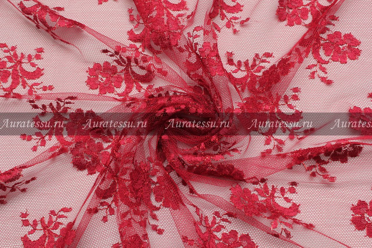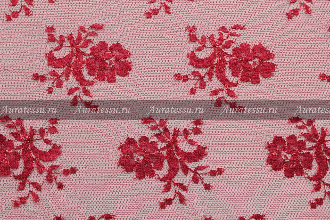 Тонкое тёмно-красное кружево с узором в виде цветочков с листиками на сетчатой основе. По контуру рисунок украшен люрексовой нитью в цвет. По обе стороны полотна не широкий ажурный фестон. Полотно мягкое, пластичное. Подходит для пошива нарядной и сценической одежды, а так же в качестве украшения и отделки.