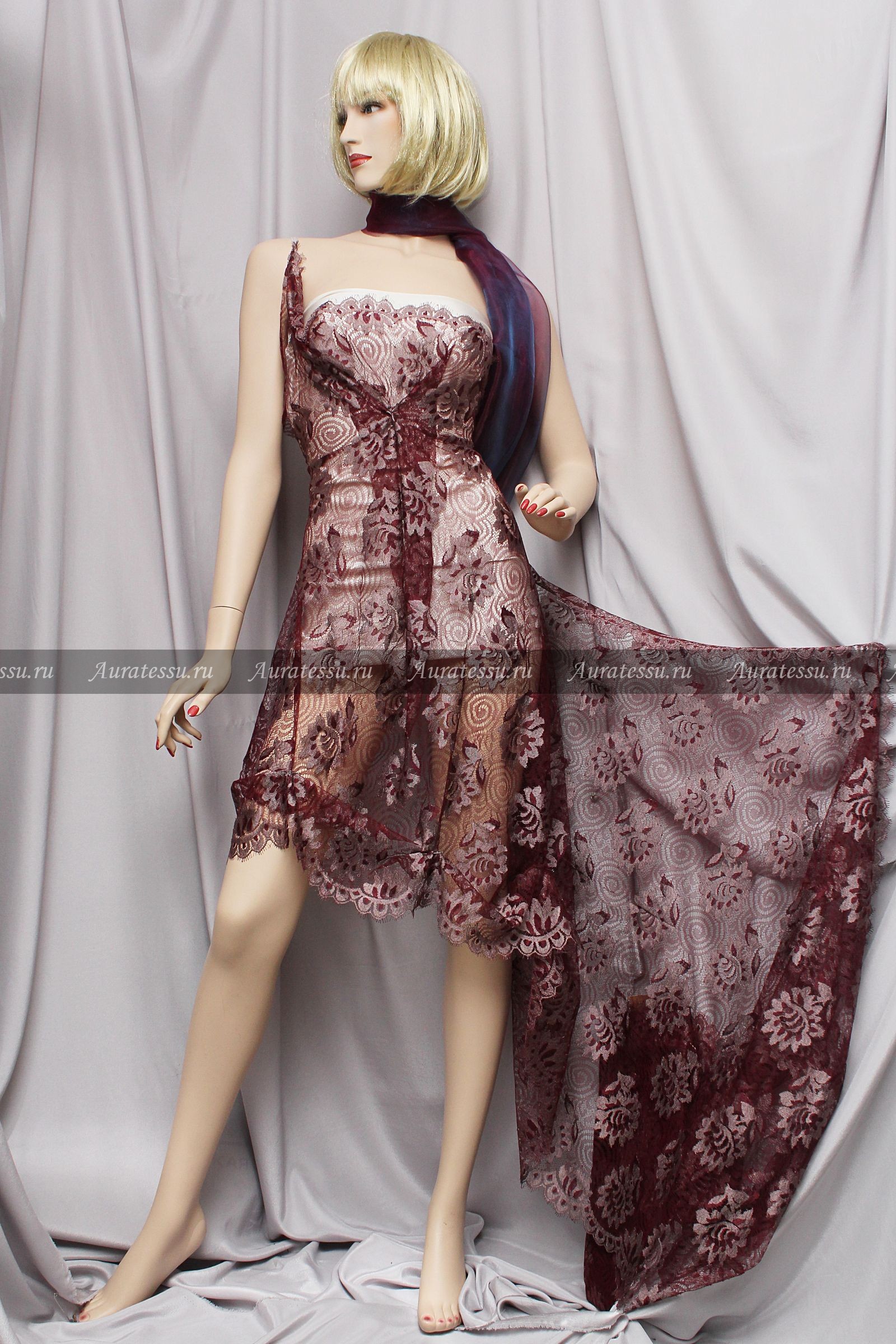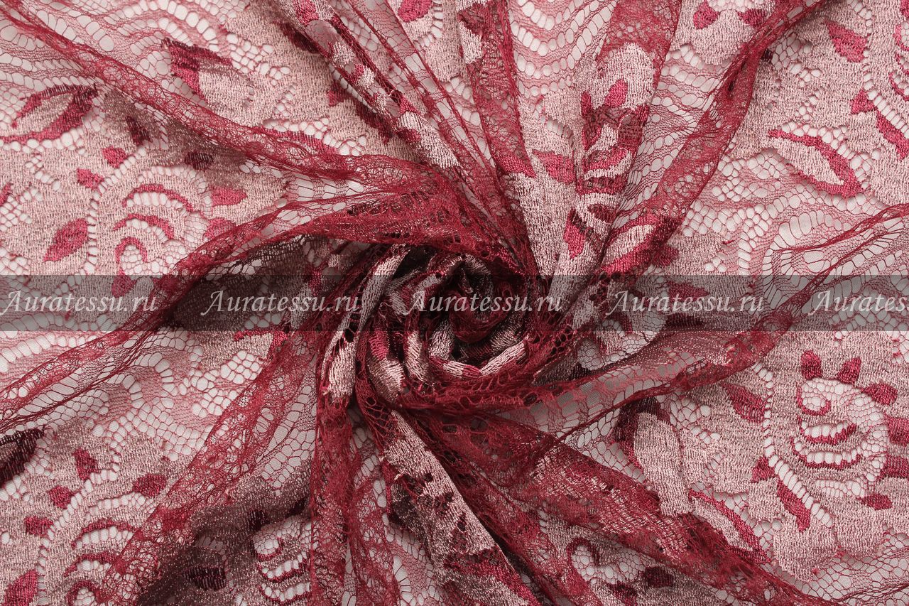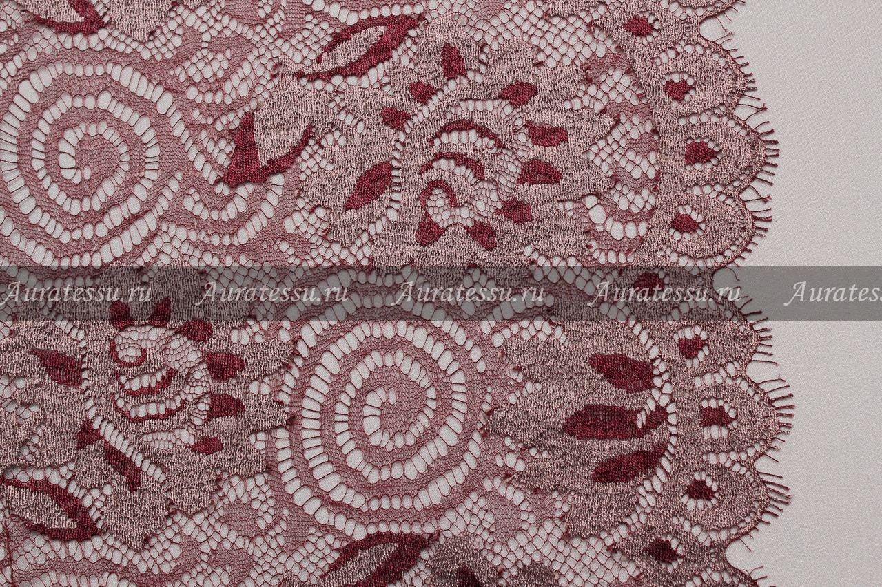 Французское черное кружево Solstiss в бордовом и лиловом цветах на мягкой крупноячеистой сетке. Узор цветочный со спиралями на сетчатой основе, богатый, не мелкий переходящий по кромкам в красивые фестоны. Благодаря использованию двух оттенков, рисунок выглядит объёмно и выразительно. Полотно пластичное, устойчивое к механическим повреждениям. Подходит для пошива нарядной, праздничной одежды. Очень эффектно будет выглядеть на атласной подкладке.