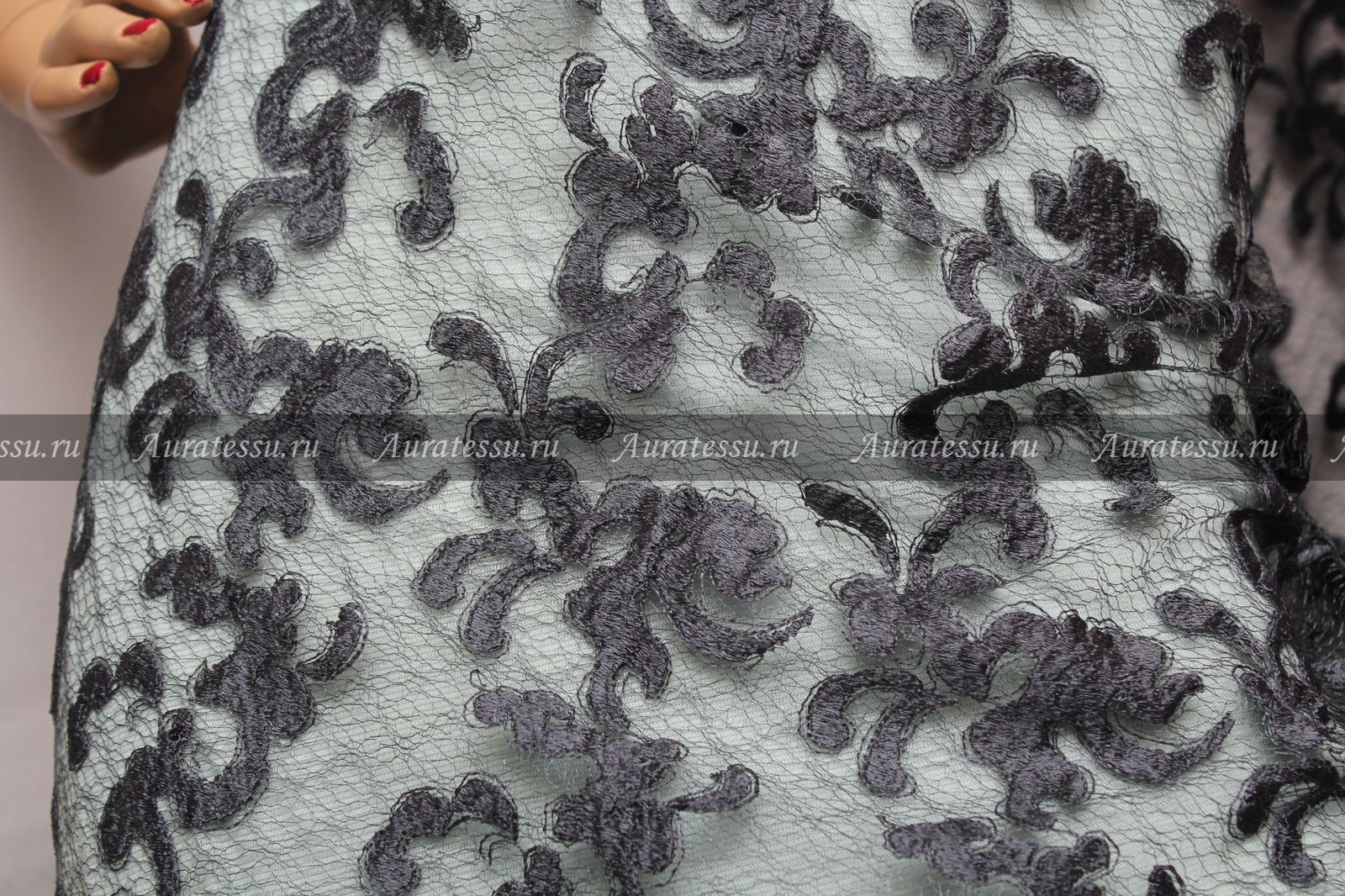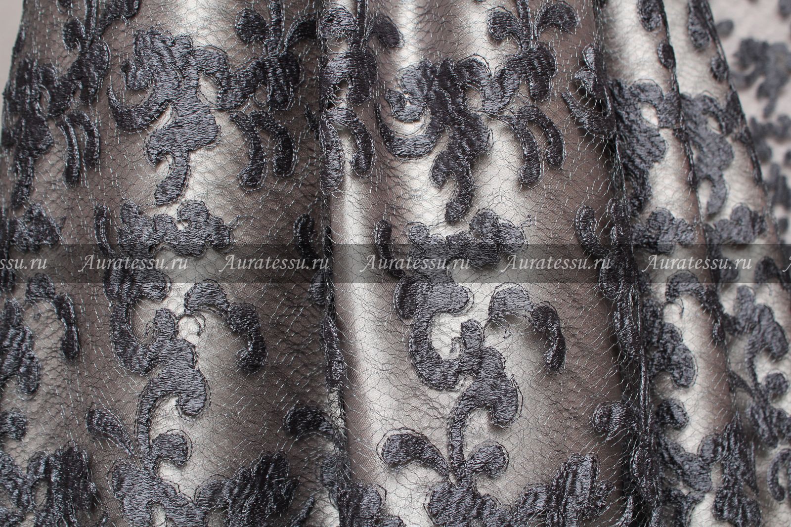 Мягкое и пластичное кружево-макраме. Глянцевая объемная вышивка гладью. Растительный орнамент серо-графитового цвета, достаточно густой, на упругой сетке в тон. У полотна симметричные фестоны по обеим кромкам. Подходит для пошива нарядной одежды. Нуждается в нижнем изделии (чехол - подкладка).