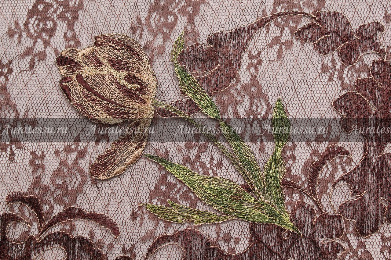 Кружево Jean Bracg коричневое с вышитыми тюльпанами