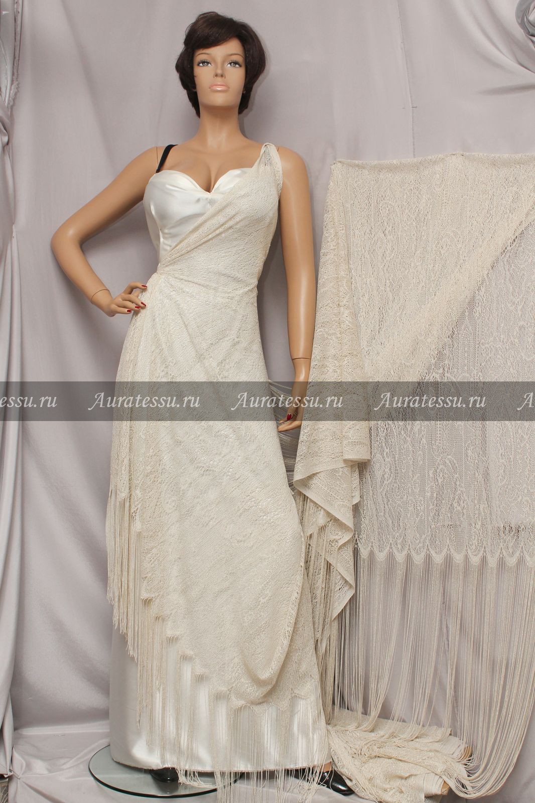 Готовый, нарядный палантин, молочного цвета с золотым люрексом длиной 2,2м. (вместе с бахромой). Бахрома в виде вязаных нитей с золотым блеском, длиной 30 см. тяжёлая и шелковистая. Само полотно ажурного, кружевного плетения, полупрозрачное, мягкое и пластичное, устойчивое к зацепкам. Подходит для использования в готовом виде, для торжественных случаев.