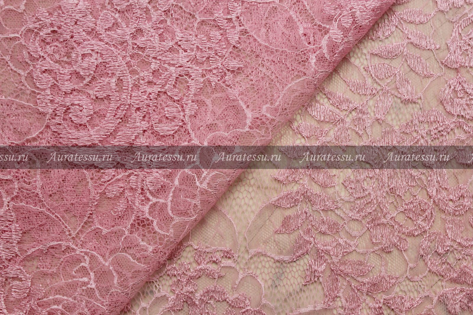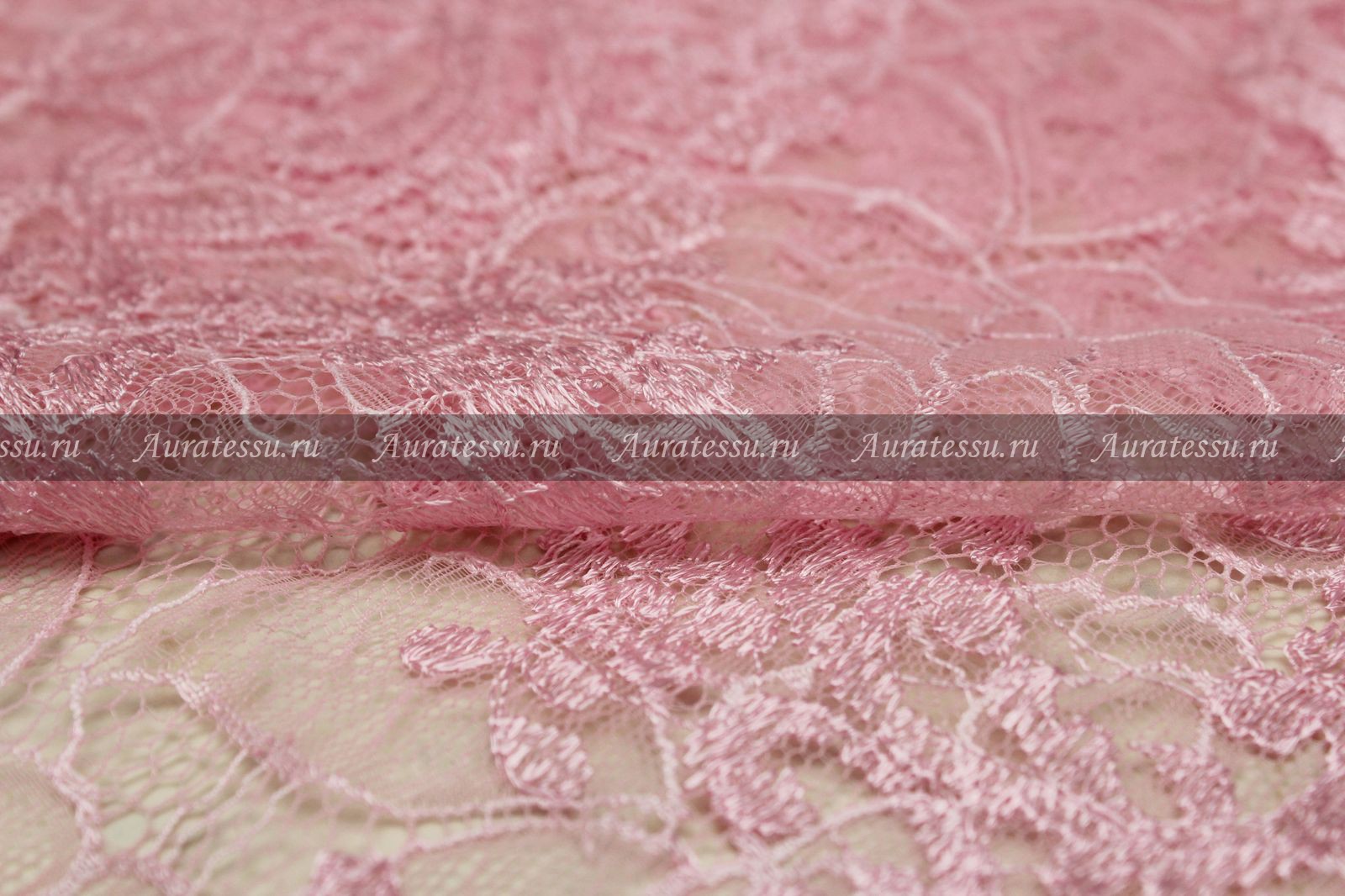 Мягкое, пластичное кружево нежно-розового цвета с цветочно-вензельным орнаментом и фестонами по обеим кромкам. Рисунок кружева достаточно густой. У полотна симметричные фестоны по обеим кромкам. Подходит для пошива нарядной одежды. Нуждается в нижнем изделии (чехол - подкладка).