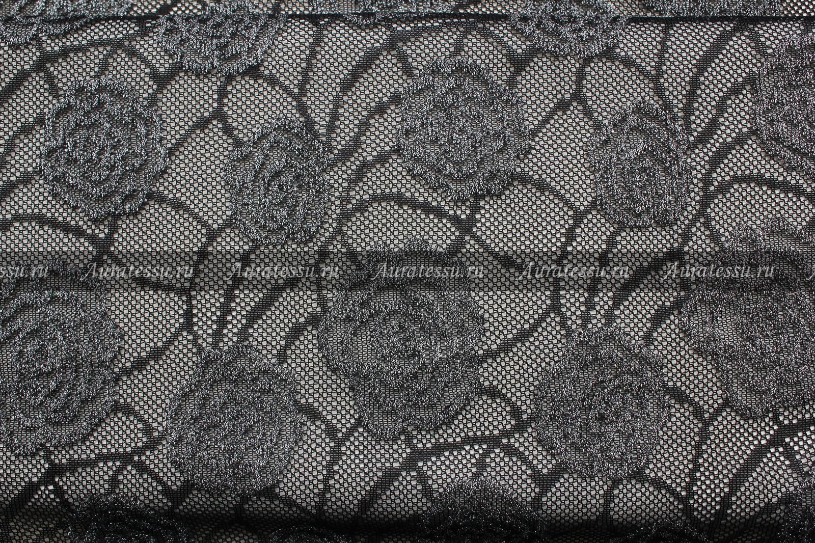 Кружево ажурное с серыми розами на чёрно-сером фоне