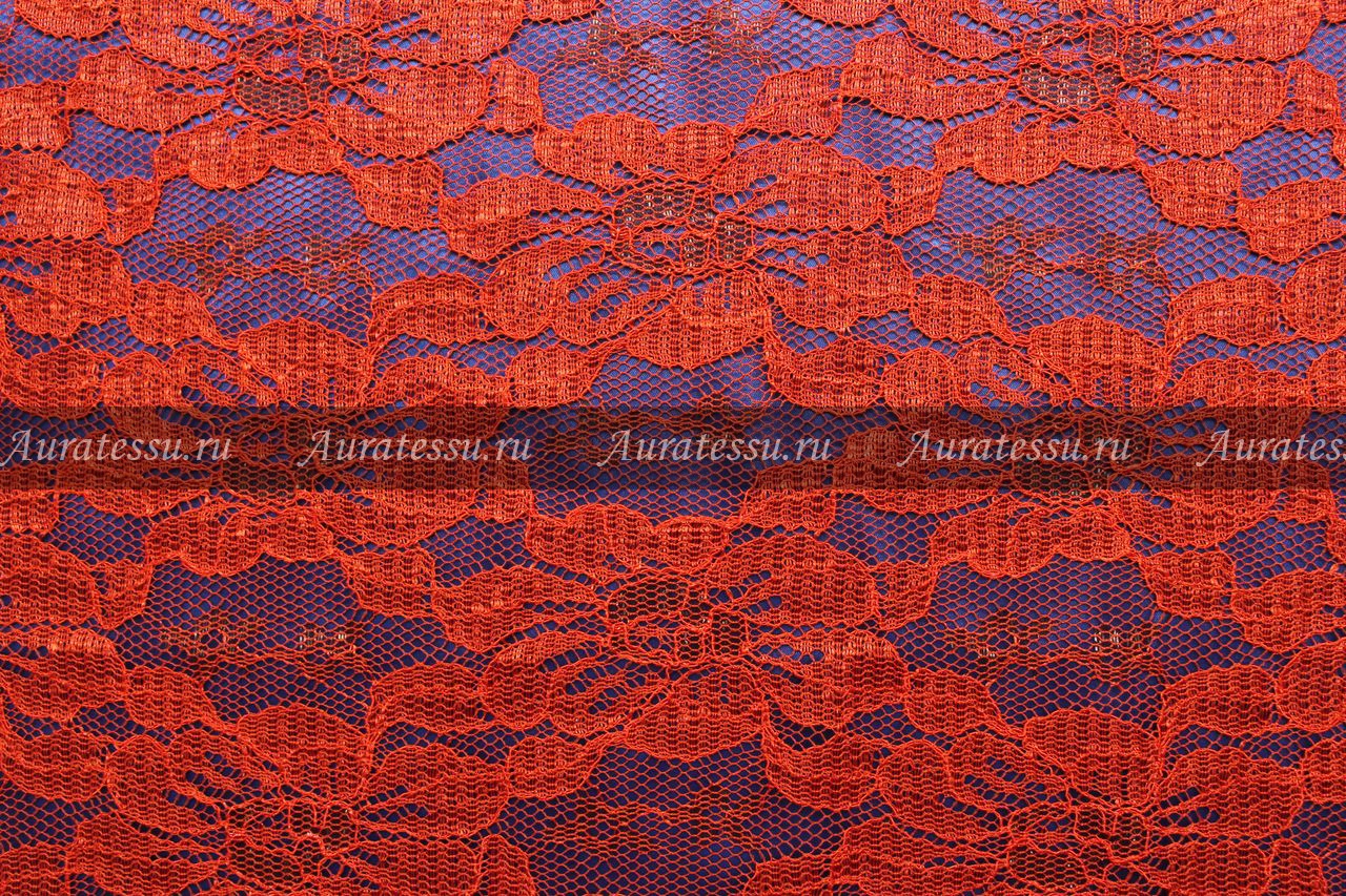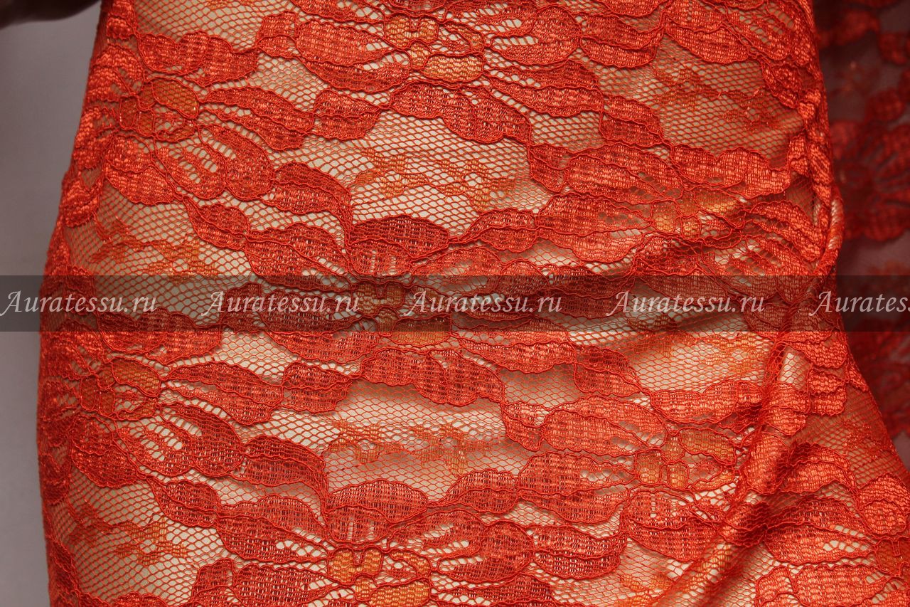 Кружево ярко-оранжевого цвета с густым цветочным узором. По контуру рисунок усилен кордированной нитью в тон, что придаёт полотну дополнительную глубину и объём. Подходит для пошива нарядной одежды. Нуждается в нижнем изделии (чехол - подкладка).