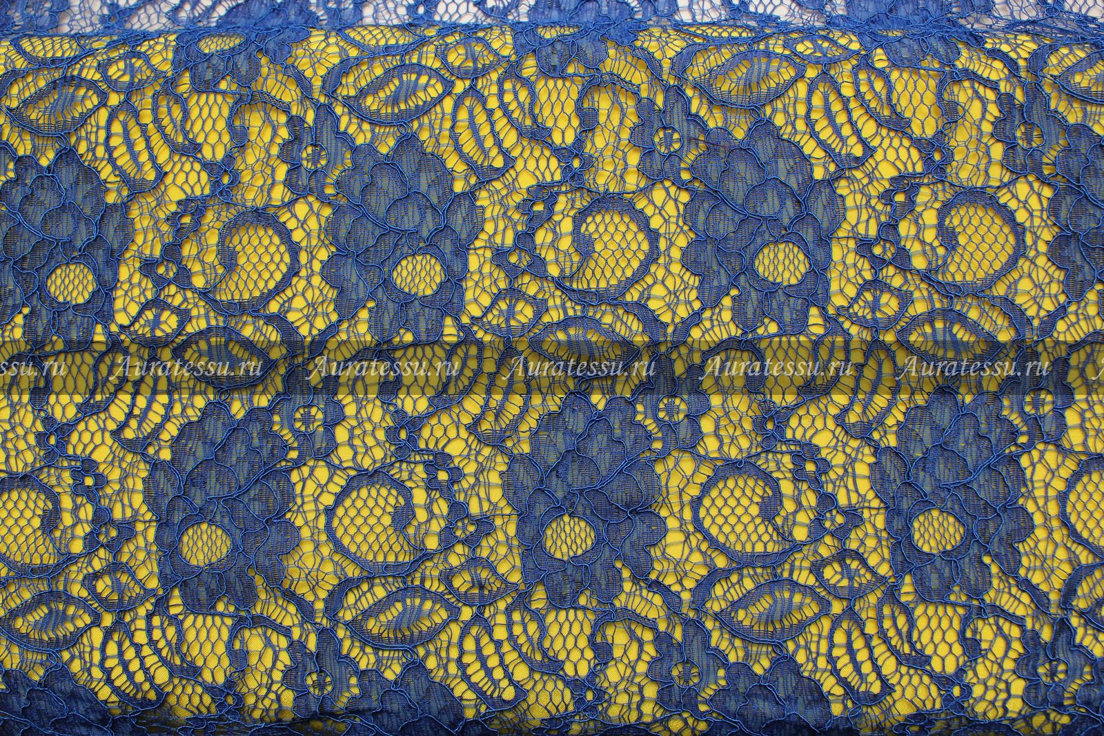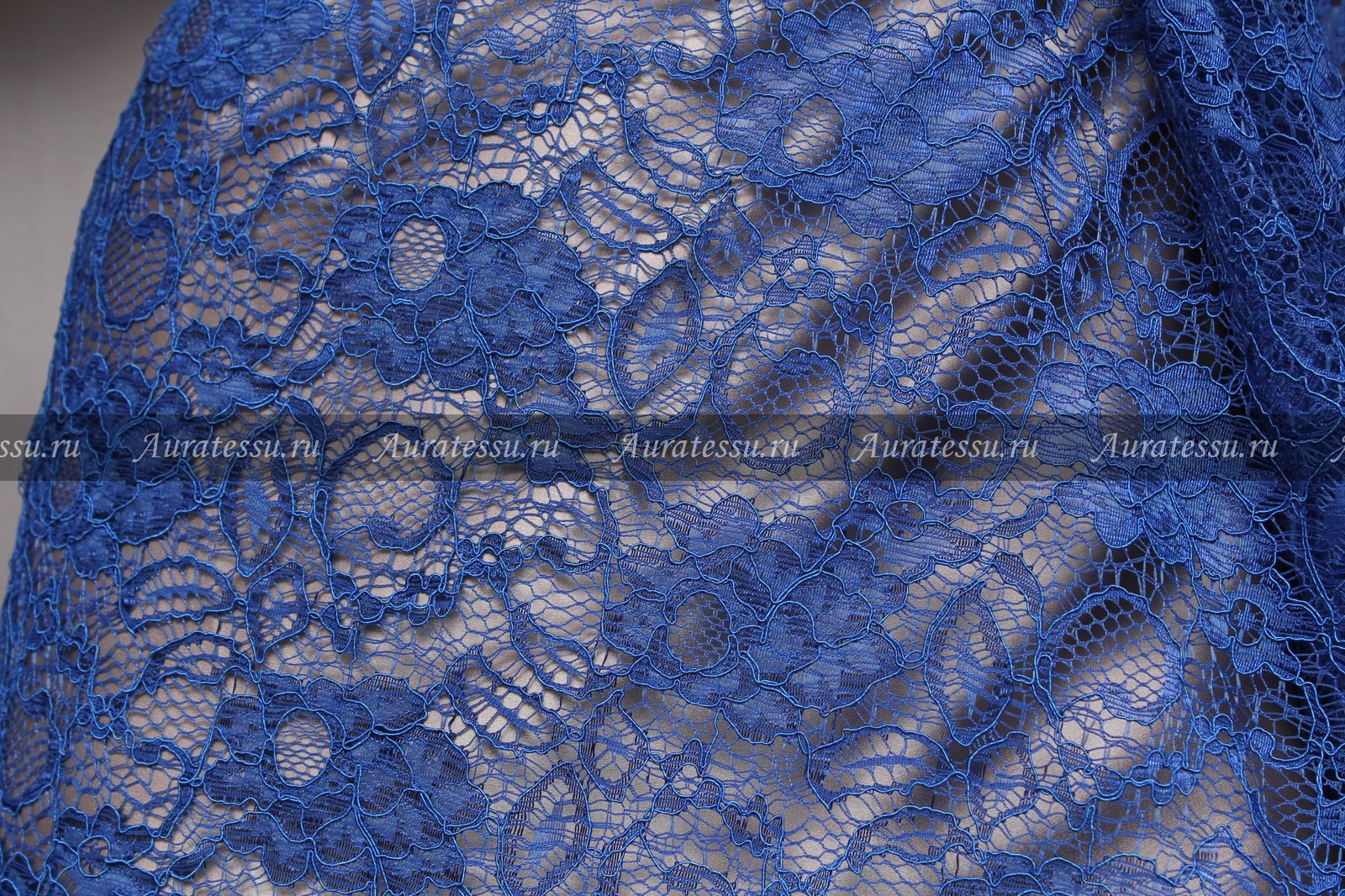 Ярко-синее, кобальтовое кружево с кордом по цветочному узору и волнистым фестоном по обеим кромкам. Сетчатая основа кружева очень нежная по своей фактуре, но крепкая к механическим воздействиям. Полотно матовое, пластичное, износостойкое, практически не мнётся. Подходит для пошива нарядной женской одежды прямых и свободных силуэтов. Для платьев желательно атласная подкладка.