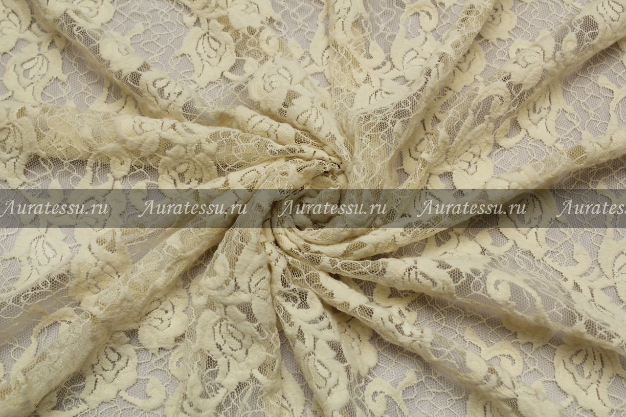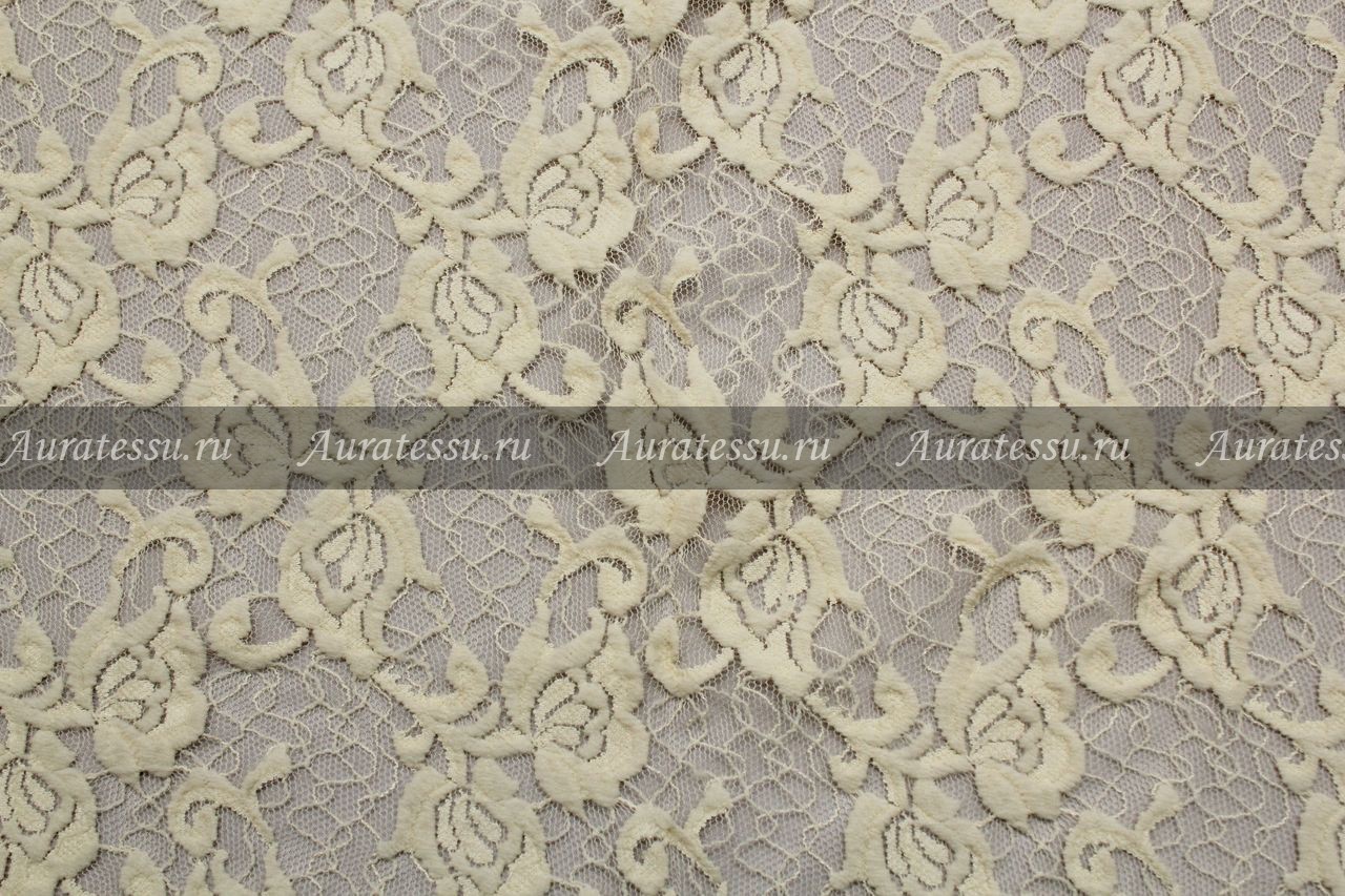 Молочно-бежевое кружево с цветочным, плотным и выпуклым узором. Полотно средней плотности, слегка прозрачное. Узор похож на вышивку гладью. Основа кружева мягкая сетка с волнистым узором. Полотно пластичное, отлично драпируется. Подходит для пошива лёгкой кружевной одежды разнообразных силуэтов.