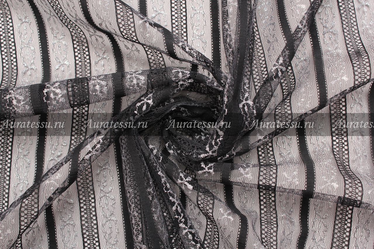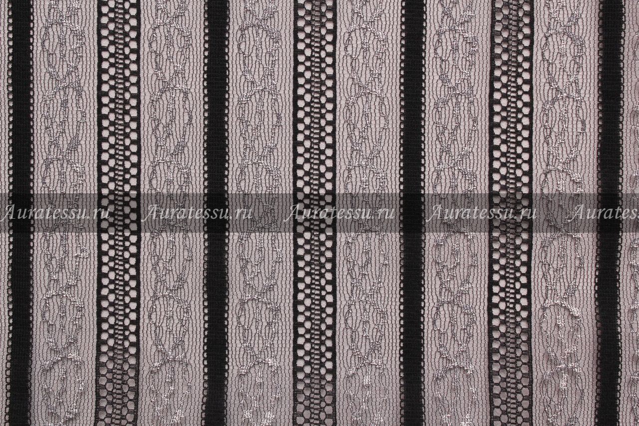 Тонкое, ажурное чёрное кружево с поперечным, не крупным рисунком (чередование черного и серебряного узора). В рисунке присутствует серебряный люрекс и повторение мотивов. Полотно упругое, держит форму. Может использоваться как для самостоятельного изделия (блуза, платье), так и для отделки. Можно разрезать на продольные фрагменты. Будет эффектно выглядеть, на атласной подкладке.