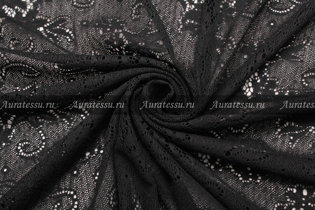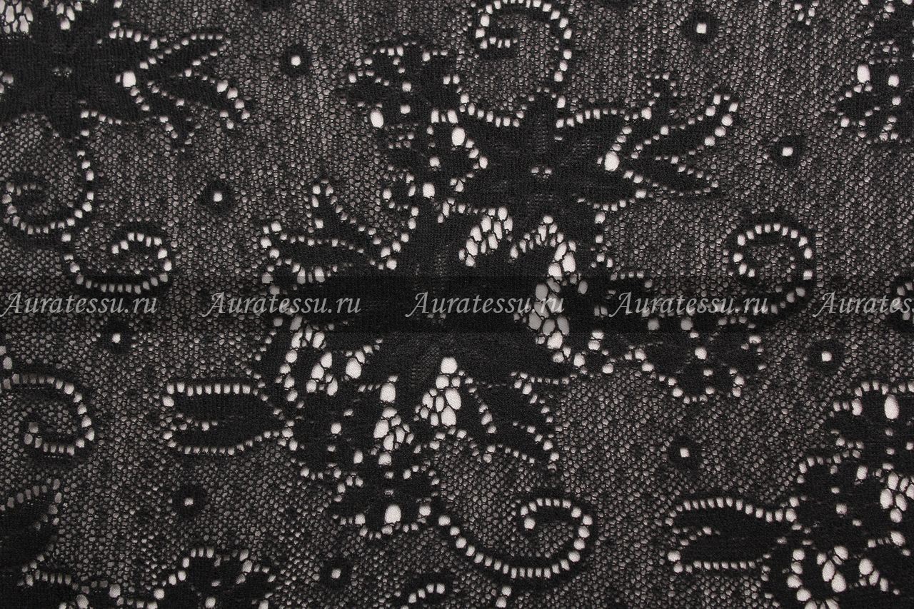 Шерстяное, полупрозрачное кружевное полотно, с добавлением синтетических волокон (для практичности) чёрного цвета с изысканным цветочно-растительным узором. Полотно эластичное, мягкое, уютное. Подходит для пошива нарядной, праздничной одежды разнообразных моделей и силуэтов.