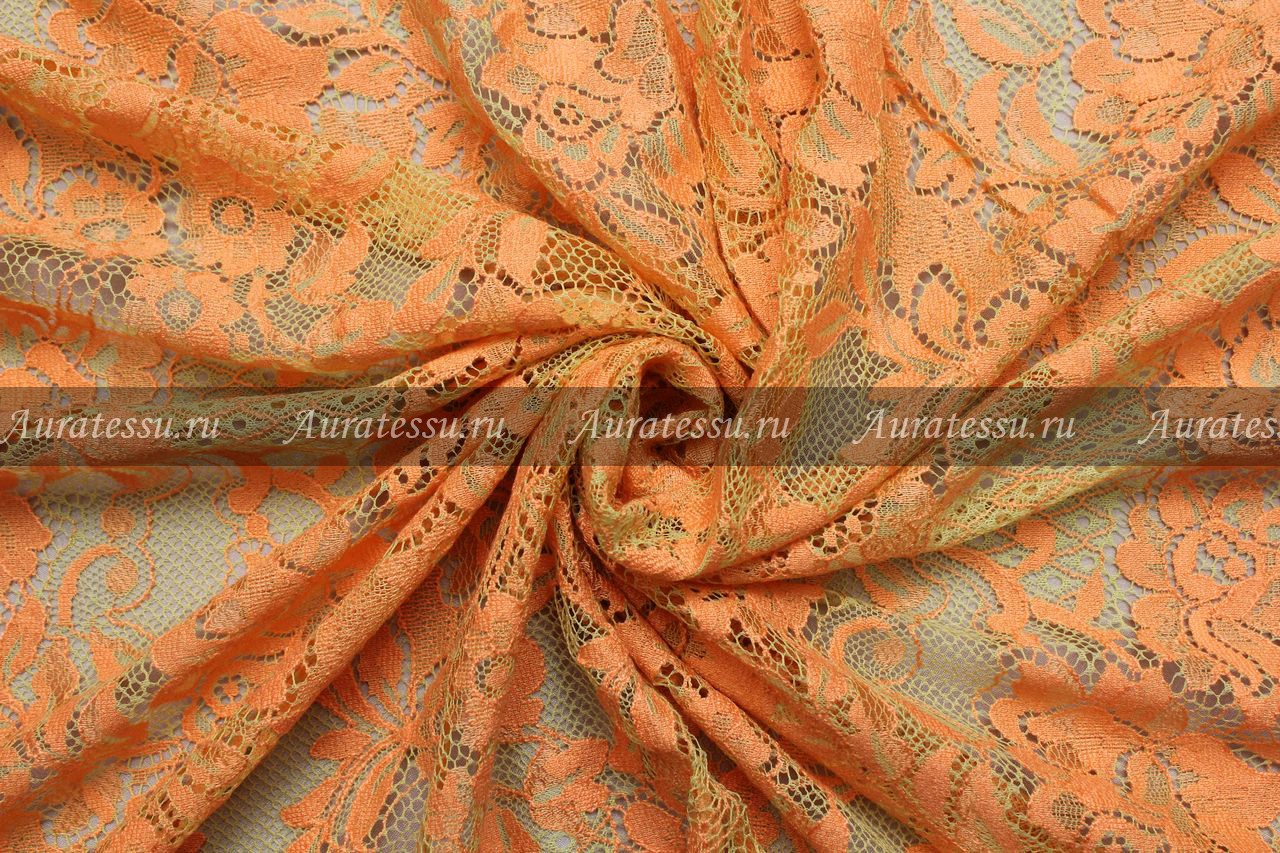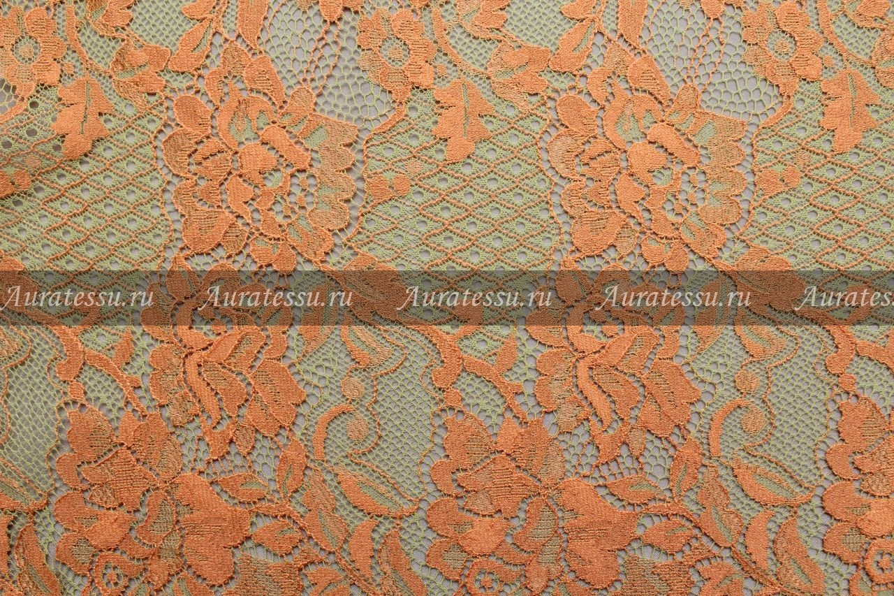 Вестфальское кружевное полотно светло-оранжевого цвета на сетчатой основе светло-зелёного цвета. Рисунок кружева растительно-цветочный. Полотно мягкое, очень пластичное, красиво лежит в сборке. Кружевной орнамент слегка перламутровый. Подходит для пошива нарядной женской одежды. Требует подкладку.