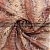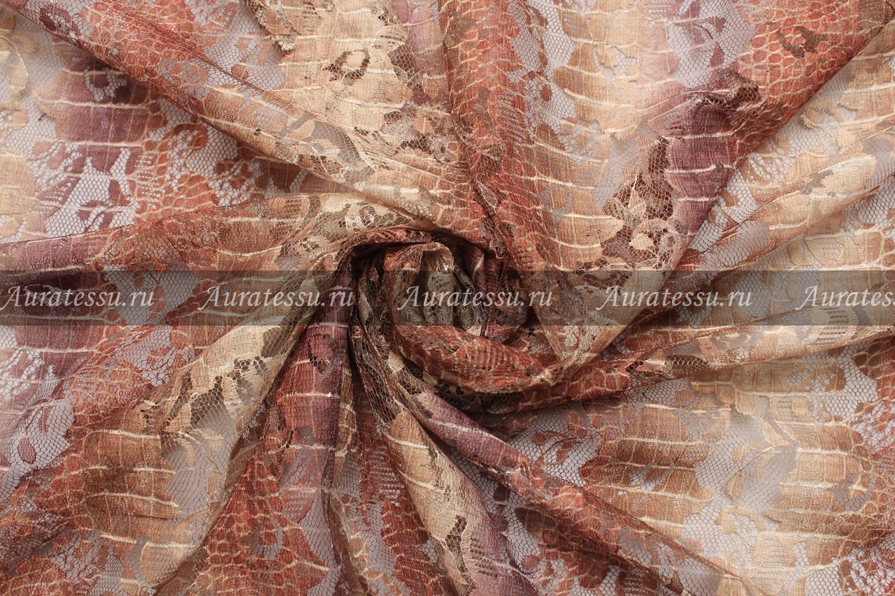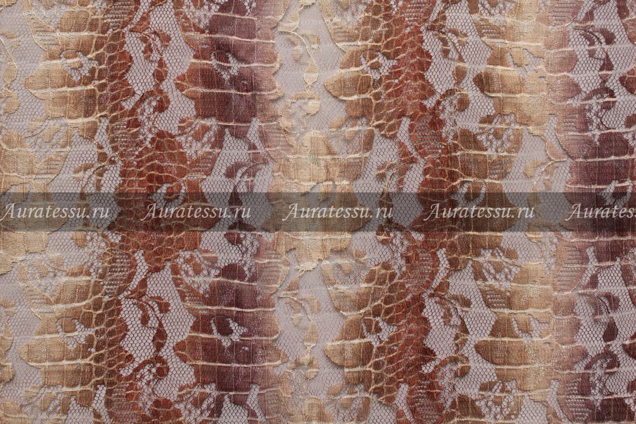 Цветочное кружево на сетчатой основе песочно-бежевого цвета с печатным узором по лицевой стороне. Узор продольный с переходом тона, напоминает хищный узор. Цветовая гамма рыжевато-коричневатых тонах, с песочными и бежевыми нотками. Узор полупрозрачный. Подходит для пошива нарядной женской одежды. Требует подкладку.