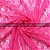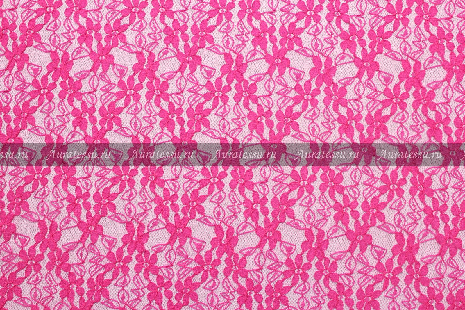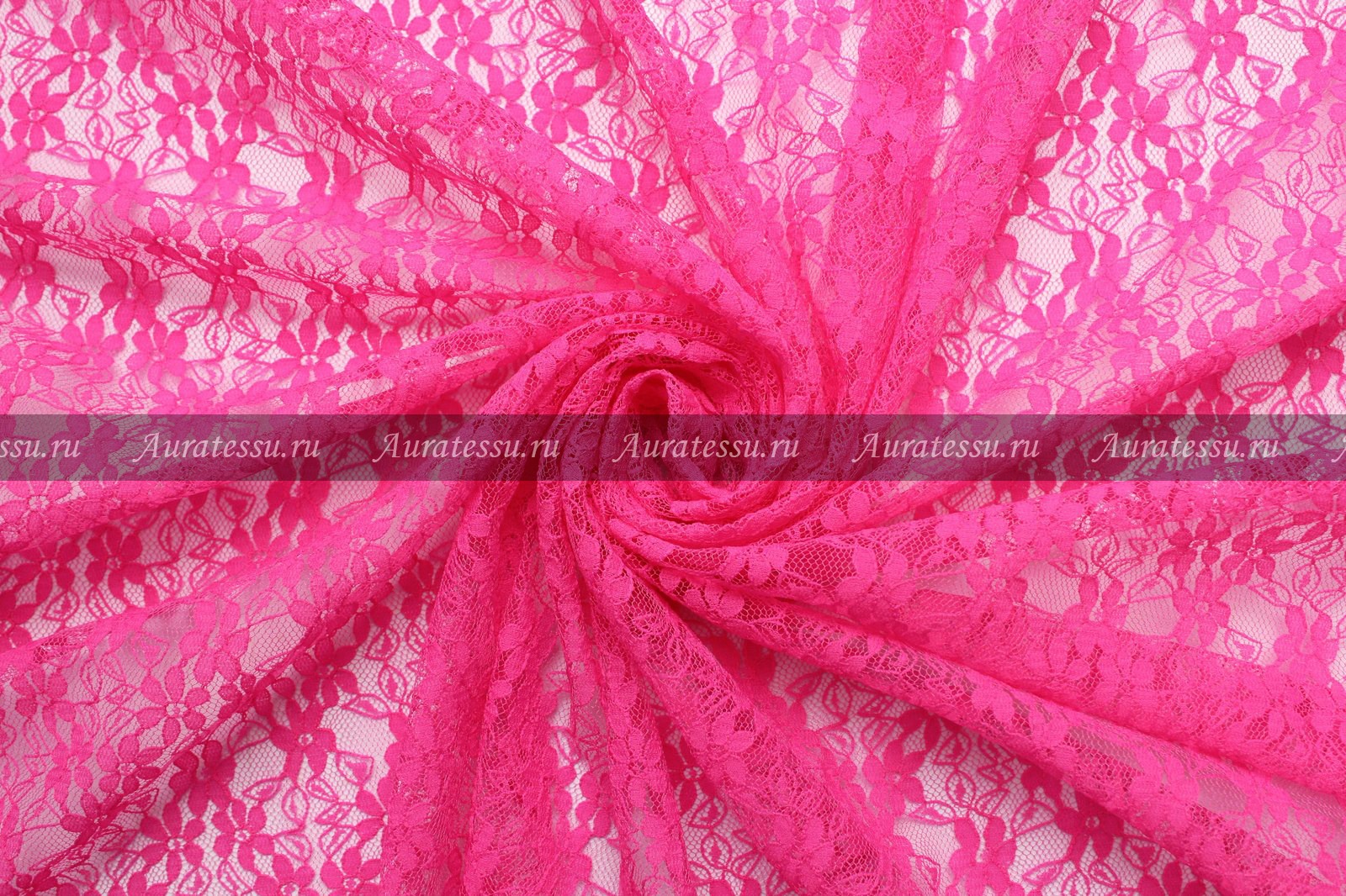 Слегка эластичное кружевное полотно яркого розового цвета с мелким цветочным узором на сетчатой основе. Узор в виде маленьких цветочков с листиками, достаточно частый и матовый. Полотно полупрозрачное, немного упругое. Подходит для пошива нарядной плательной одежды, разнообразных силуэтов, желательно на подкладке.