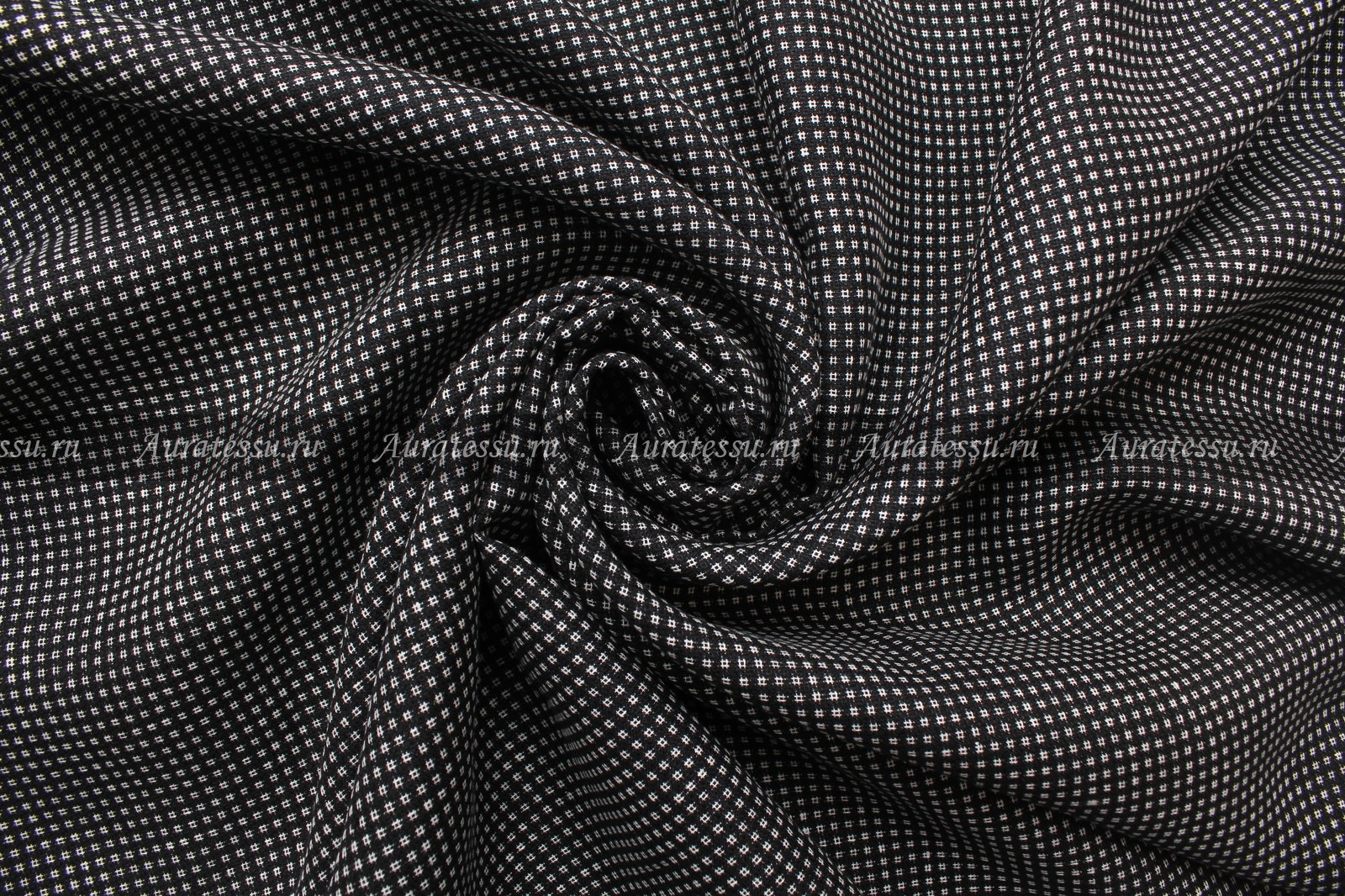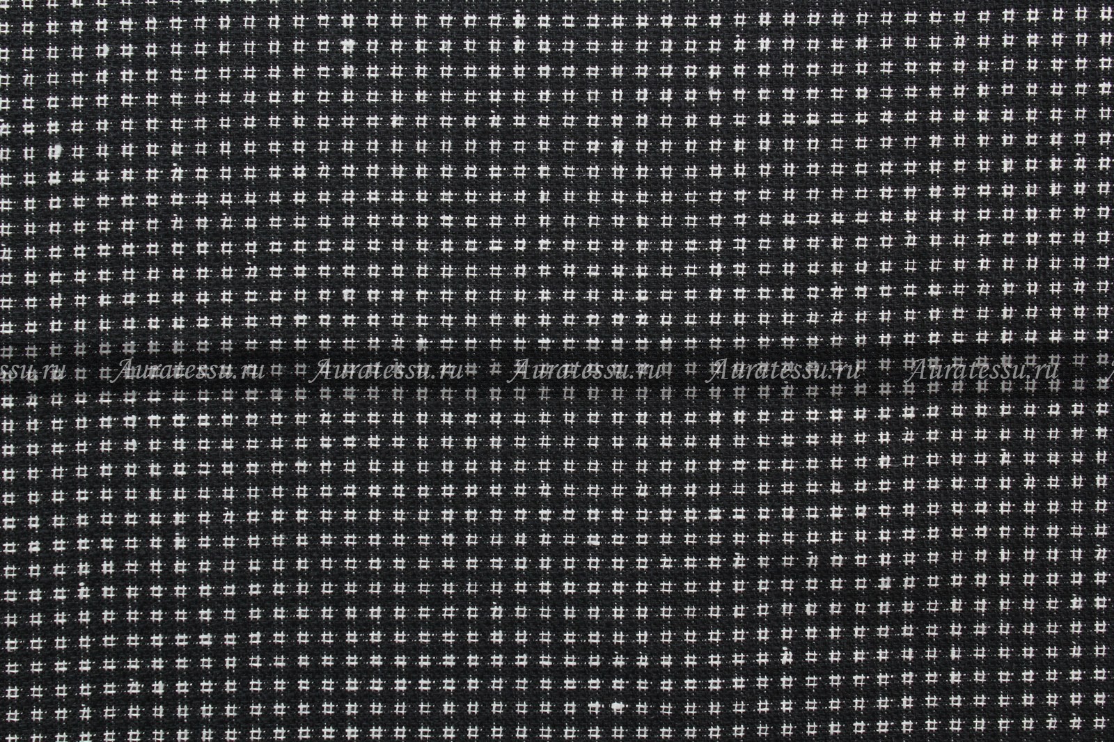 Средней плотности, шлифованный костюмный лён чёрного цвета с белыми кропами-клеточками. Полотно матовое, переплетение нитей разряженное. После стирки ткань даст значительную усадку. Подходит для пошива костюмной одежды не узких силуэтов.