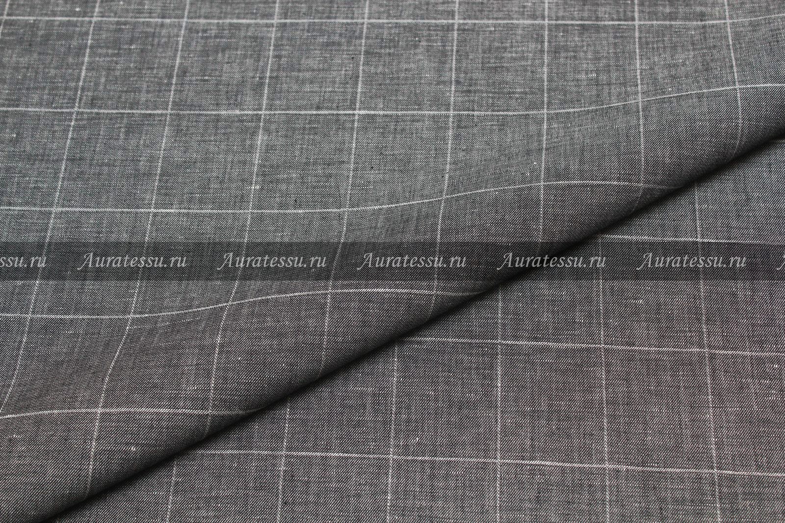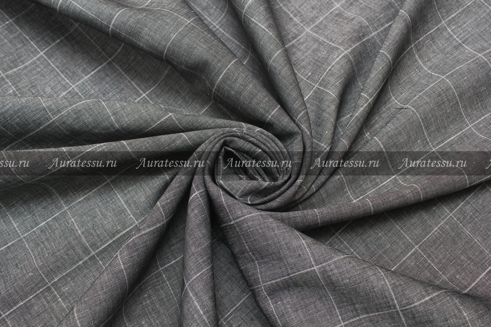 Лён костюмный с хлопком чёрно-серый меланж в клетку 200 г/мп