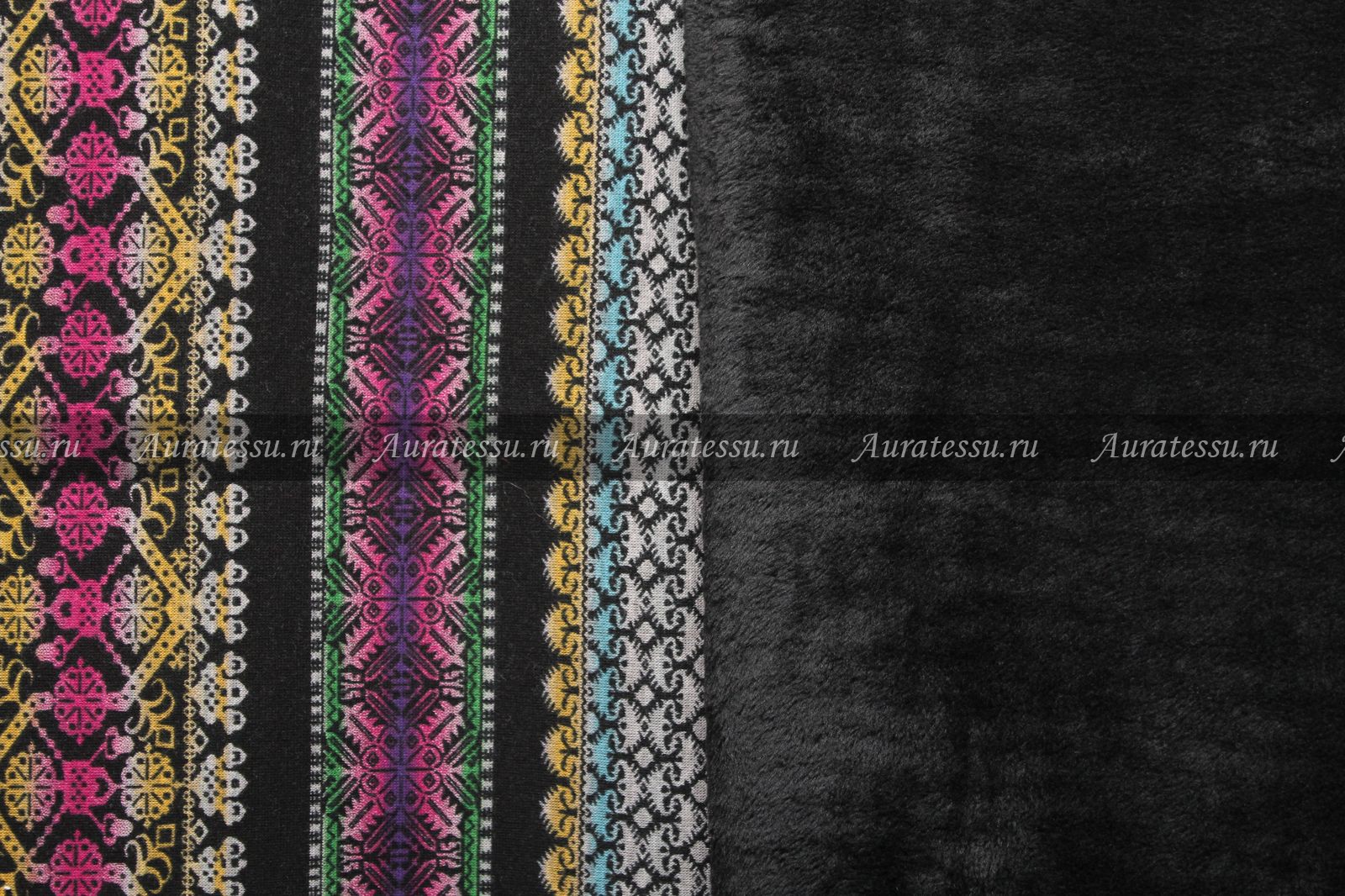 Мягкий и пластичный трикотаж с этническим чёрно-серым поперечным (орнаментными полосами) рисунком поверх которого нанесены размытые цвета: жёлтый, зелёный, розовый, фиолетовый с переходом тона. Трикотаж сдублирован с коротковорсовым искусственным мехом чёрного цвета. Полотно очень пластичное, ворс имеет чёткое направление. Подходит для пошива тёплых трикотажных изделий, спортивных курток, жилетов.