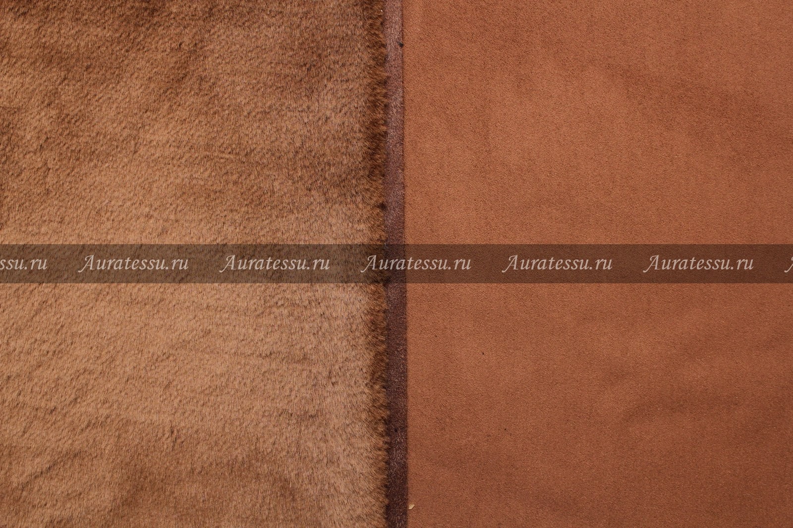 Средней плотности 1100 г/мп искусственная дублёнка. Одна сторона из искусственной замши коричневого цвета плотно сдублирована с искусственным мехом в тон замше. Ворс короткий 10-11 мм с чётким направлением. Полотно мягкое, пластичное. Подходит для пошива курточной и пальтовой одежды прямых, классических силуэтов.