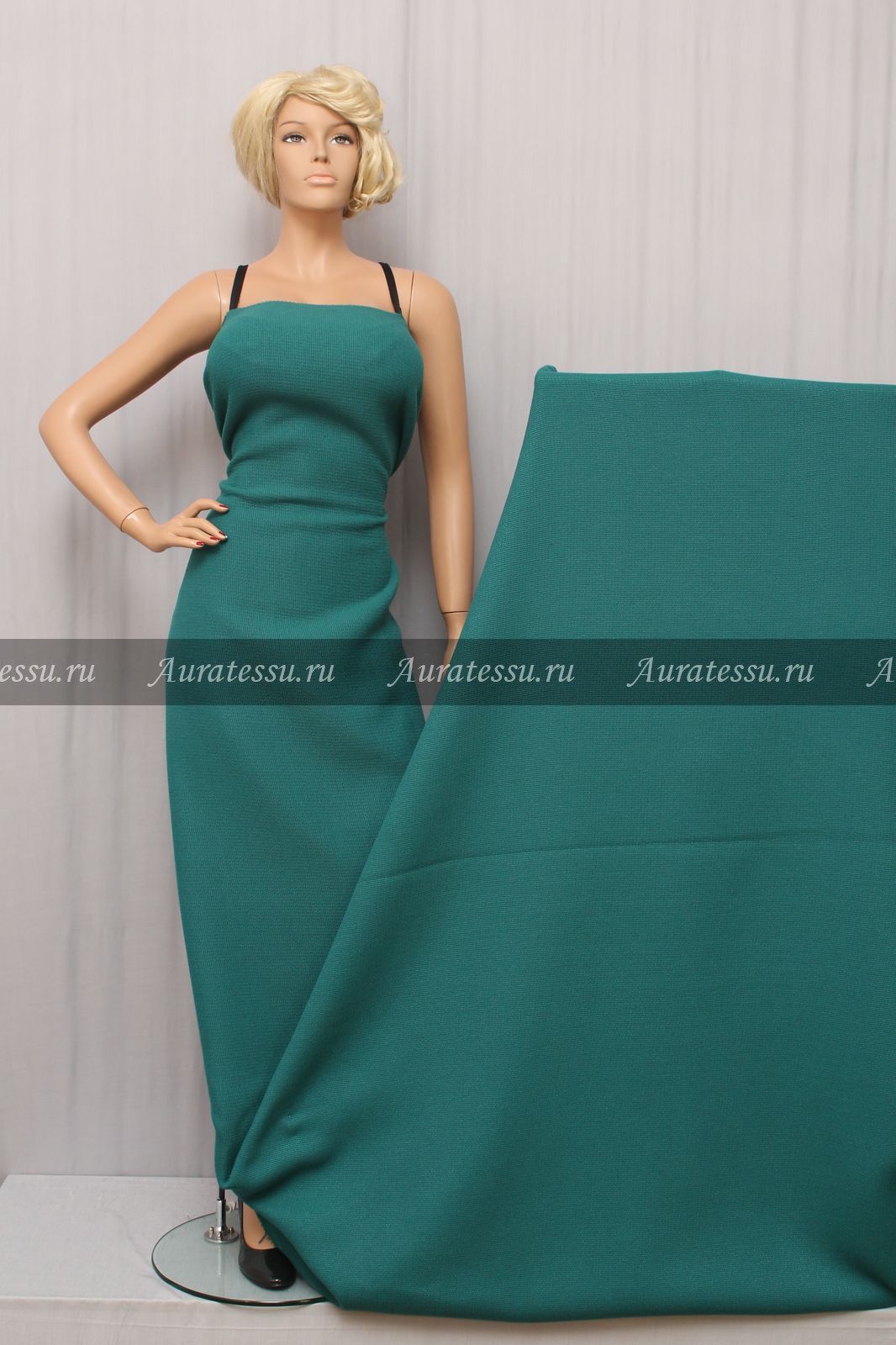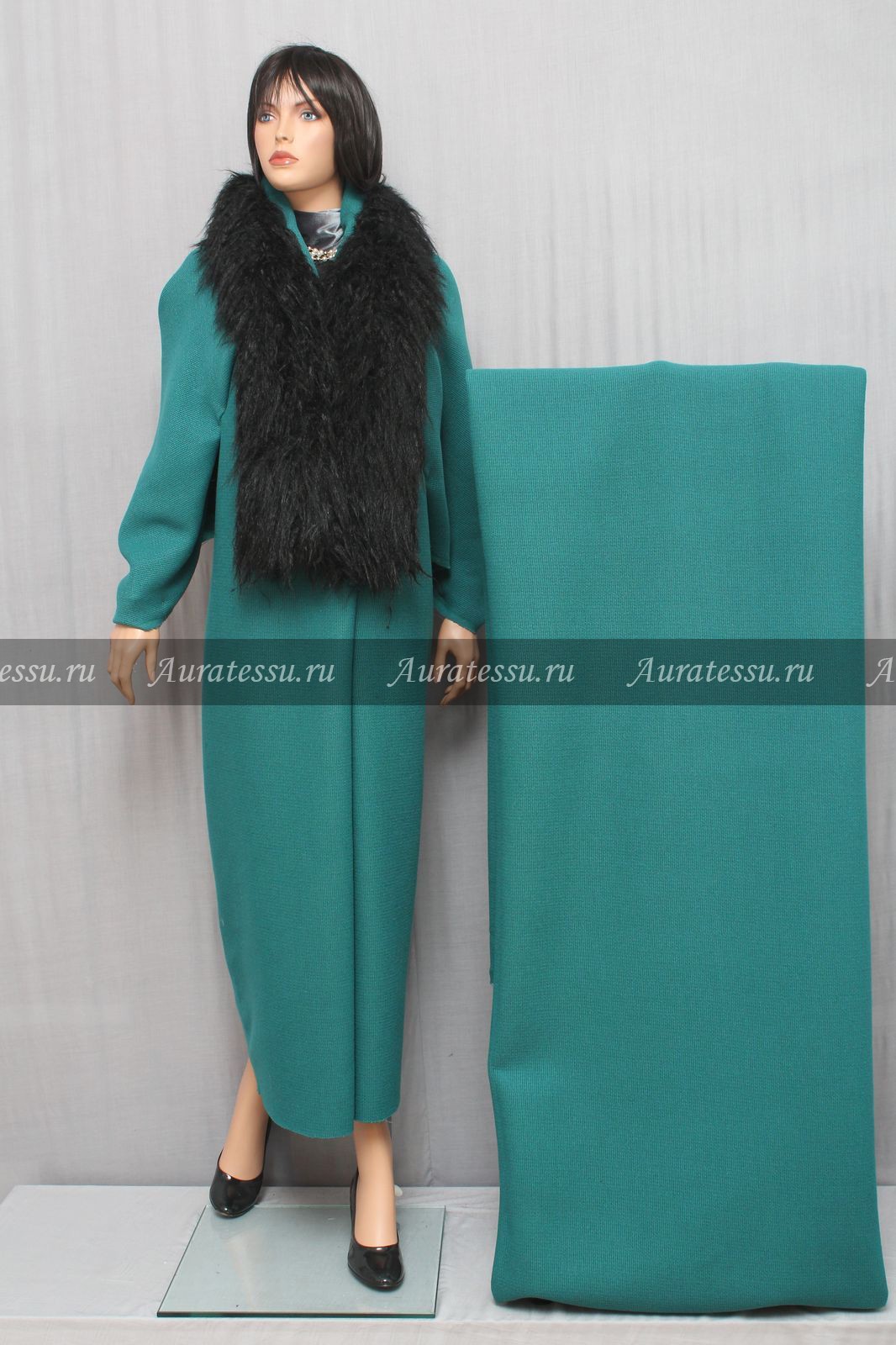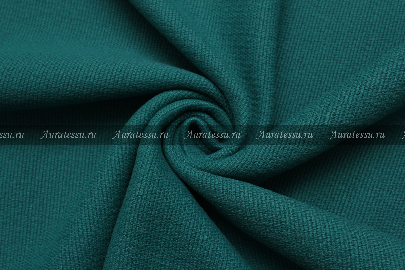 Костюмно-пальтовая шерсть бирюзово-изумрудного цвета. Верхний слой с объёмным фактурным переплетением, немного напоминающим рогожку. Нижний слой мелкожаккардового переплетения, гладкий, слегка пушистый. Обе стороны ткани могут быть использованы как лицевые. Ткань упругое, держит форму, подходит для пошива пальтово-курточной верхней одежде прямых, классических силуэтов.