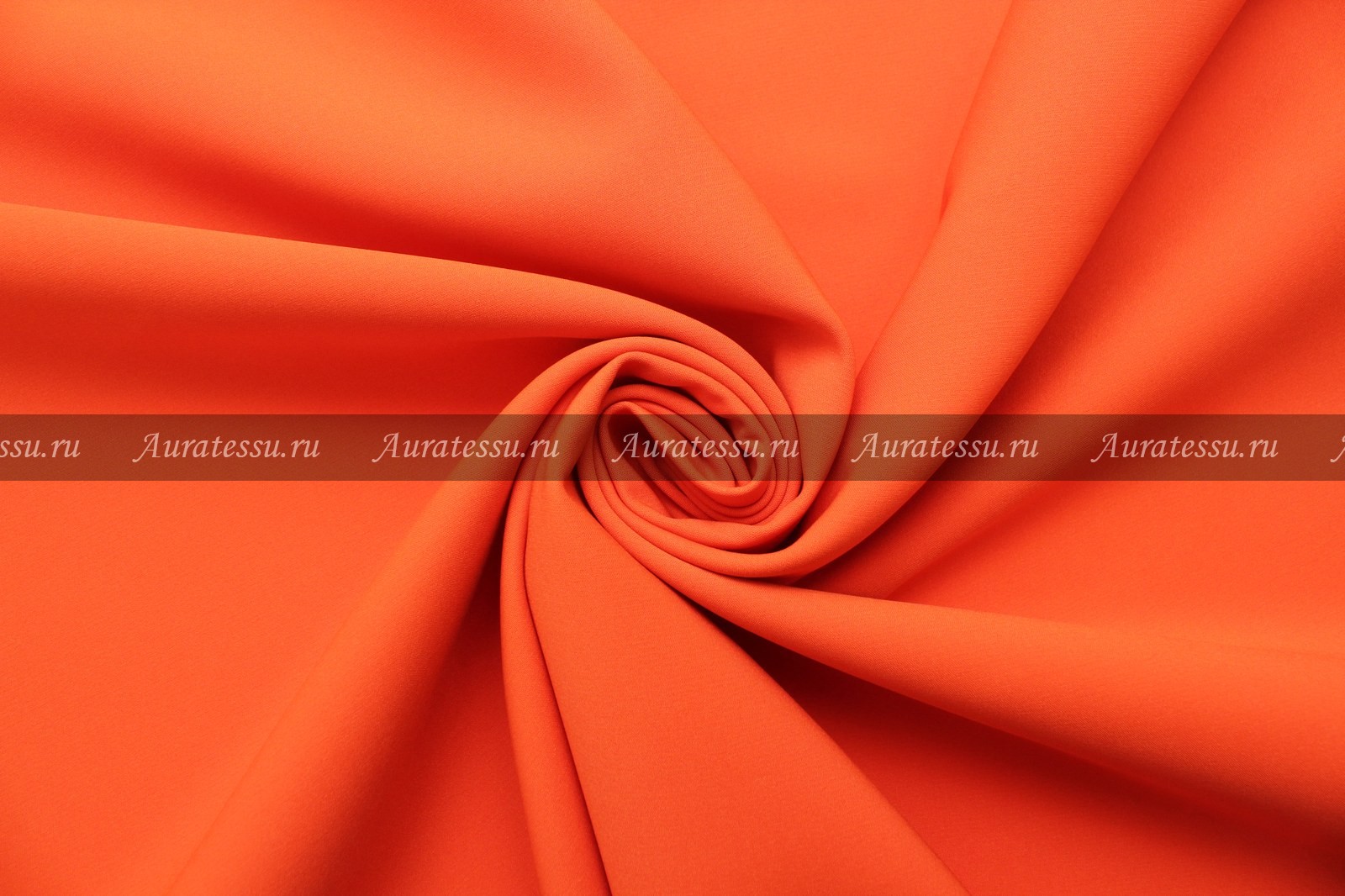 Плотная, упругая, двухслойная ткань ярко-оранжевого цвета. Поверхность гладкая, матовая. Полотно эластичное. Ткань отлично держит форму. Подходит только для упругих моделей одежды.