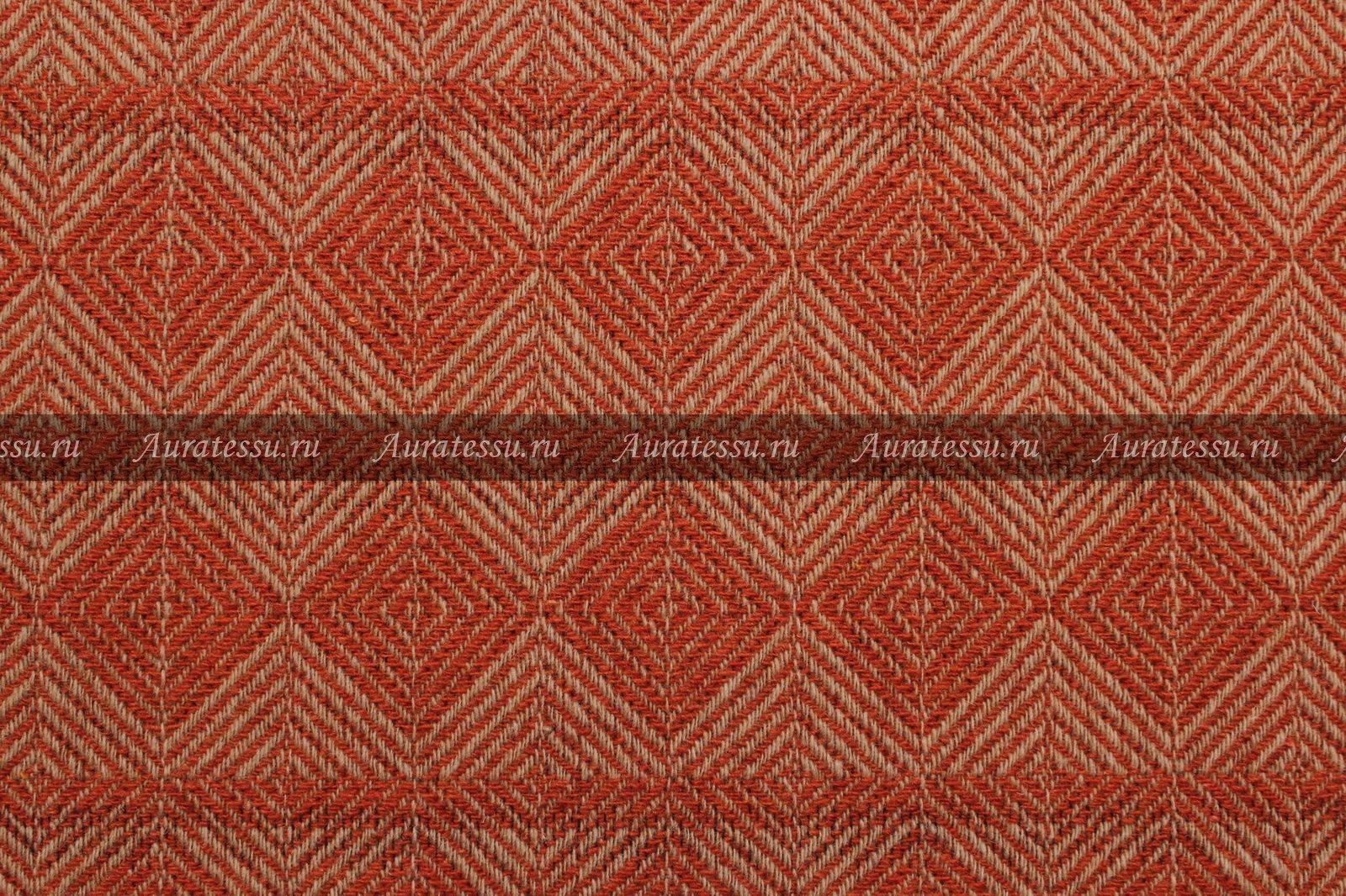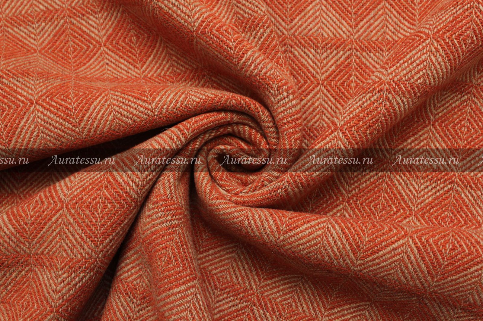 Плотная двухслойная пальтовая чистошерстяная ткань. Верхний слой с жаккардовым не крупным геометрическим узором на тему клетки. Цветовая гамма рисунка в рыжевато-терракотовом и бежевом цвете. Нижний слой тёмно-коричневый в не явный рубчик. Ткань может использоваться на обе стороны. Полотно упругое, отлично держит форму. Подходит для пошива пальтово-курточной верхней одежды прямых и расклешённых силуэтов.