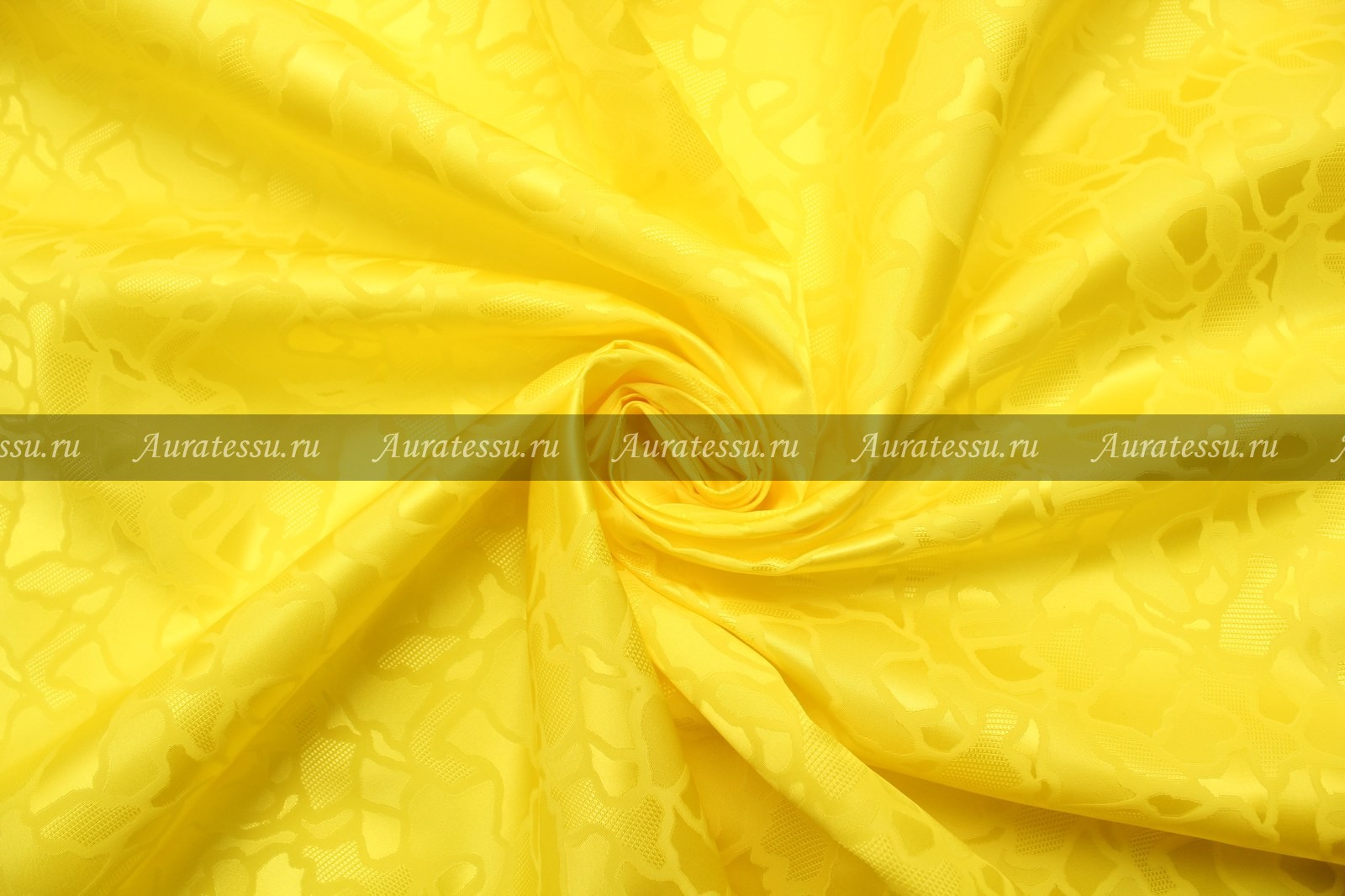 Средней плотности 280 г/м, плащёво-курточный жаккардовый атлас цвета яркого лимона. Ткань с водоотталкивающим эффектом и глянцевым витиеватым узором. Ткань упругая, держит форму. Подходит для пошива верхней одежды (плащ, куртка и т.д.)